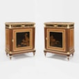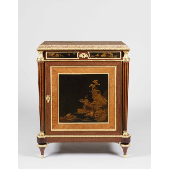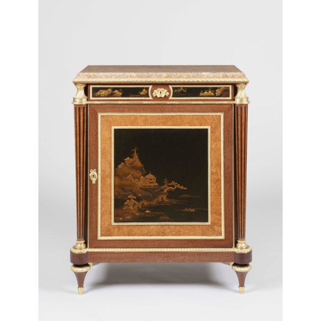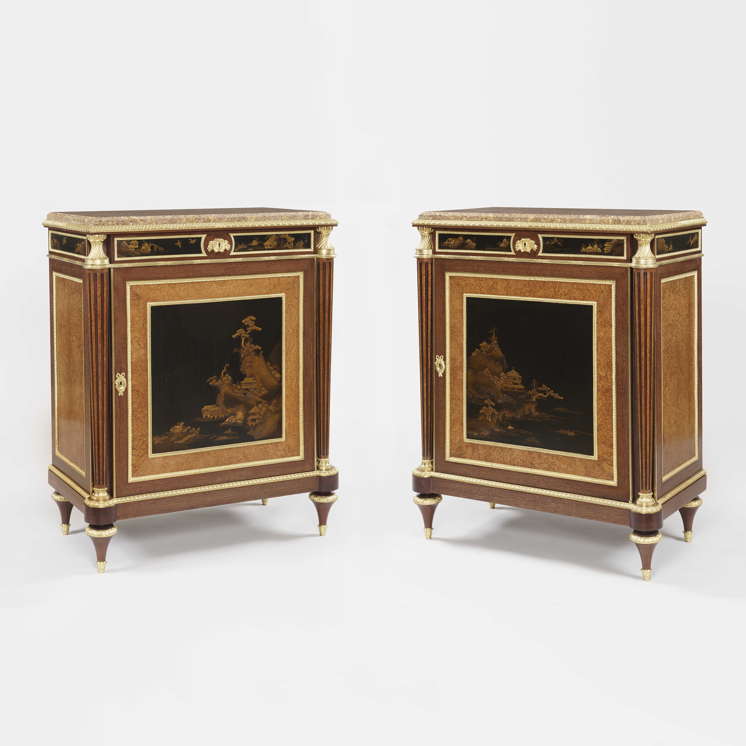 Constructed in amaranth and amboyna, and dressed with high quality ormolu bronze mounts, and Verdun Breccia marble platforms; rising from tapering cylindrical toupie feet supporting rectangular plinths having radiused everted angles, with tapering fluted side columns housed by ormolu capitols and bases; the lockable doors having oriental lacquer panels of landscapes on dark grounds, enclosing shelved interiors; lockable drawers in each apron, with conforming lacquer panel fascias enclosed within ormolu frames; running stiff leaf moulding to the tops, enclosing marble platforms with slight thumbnail angles. Stamped to the tops of the carcasses by the maker 'Henry Dasson'.