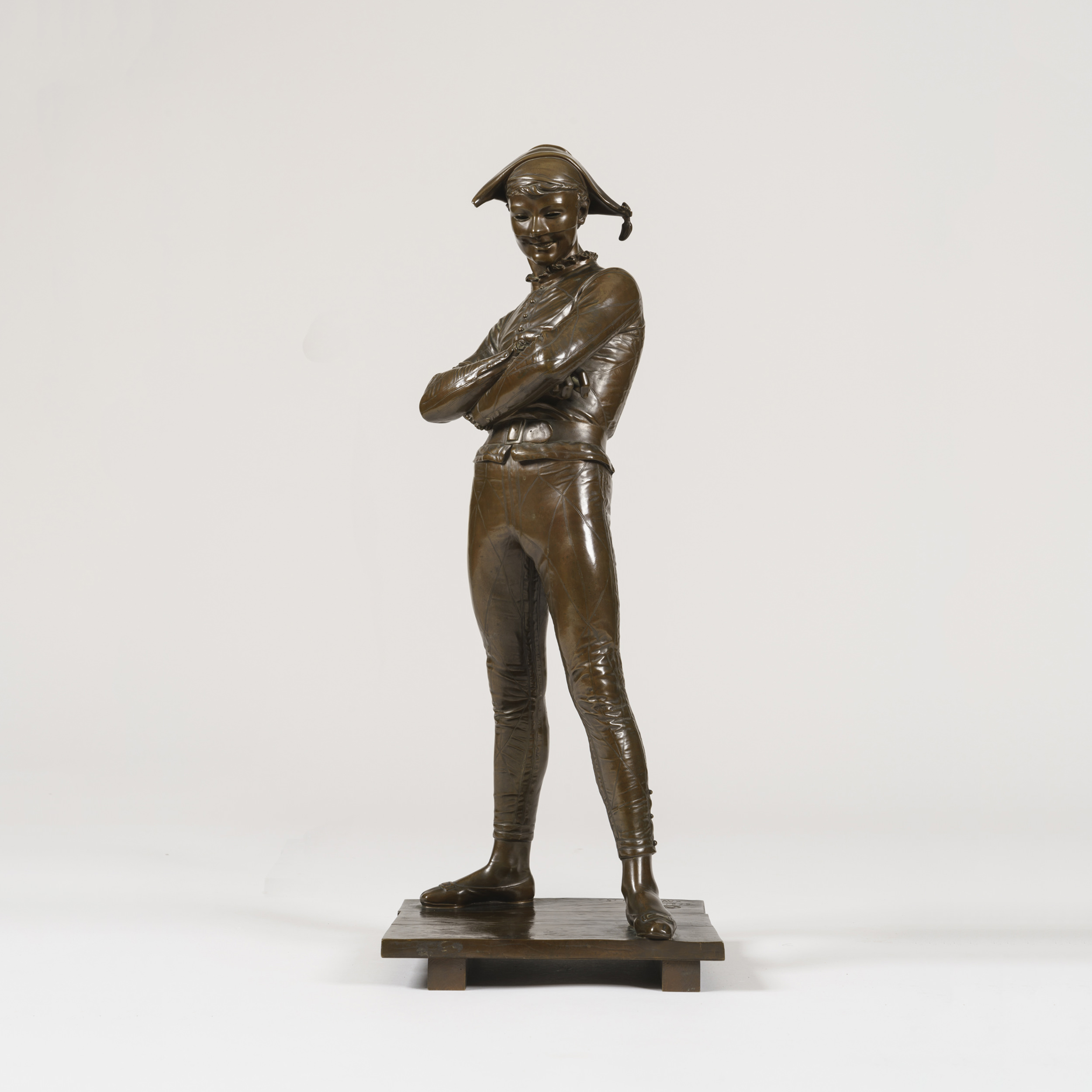 The mischievous Harlequin, arms crossed in contemplation, wearing a grin and a mask, treading the boards of the stage, as befits his leading place in the Commedia dell'arte. Signed by the fondeur, Ferdinand Barbedienne, having the foundry cachet, and dated 1879, and the sculptor's name, St. Marceaux.French, Circa 1880