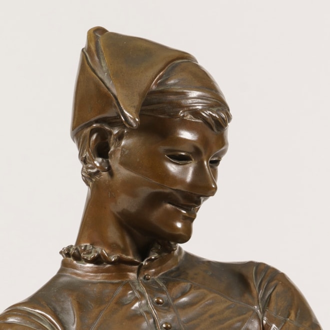 Son of a Reims wine merchant, entered the Ecole des Beaux-Arts de Paris under the tutelage of Jouffroy, exhibiting at the Salon of 1868, studying later in Italy. Considerable success followed, and he was awarded gold medals at the Paris Exposition Universelle of 1889, having been elected as a Chevalier to the Legion d'Honneur in 1880, and later becoming an officer. His public Parisian works may be seen in the Champs-Elysees (Alphonse Daudet the noted novelist) and Alexander Dumas fils, in Montmartre and the Louvre. This figure 'Arlequin' is to be seen in Reims Museum, and Bucharest Arts Museum.