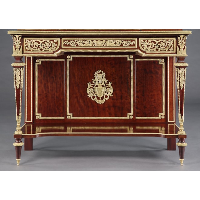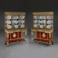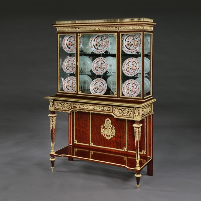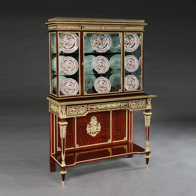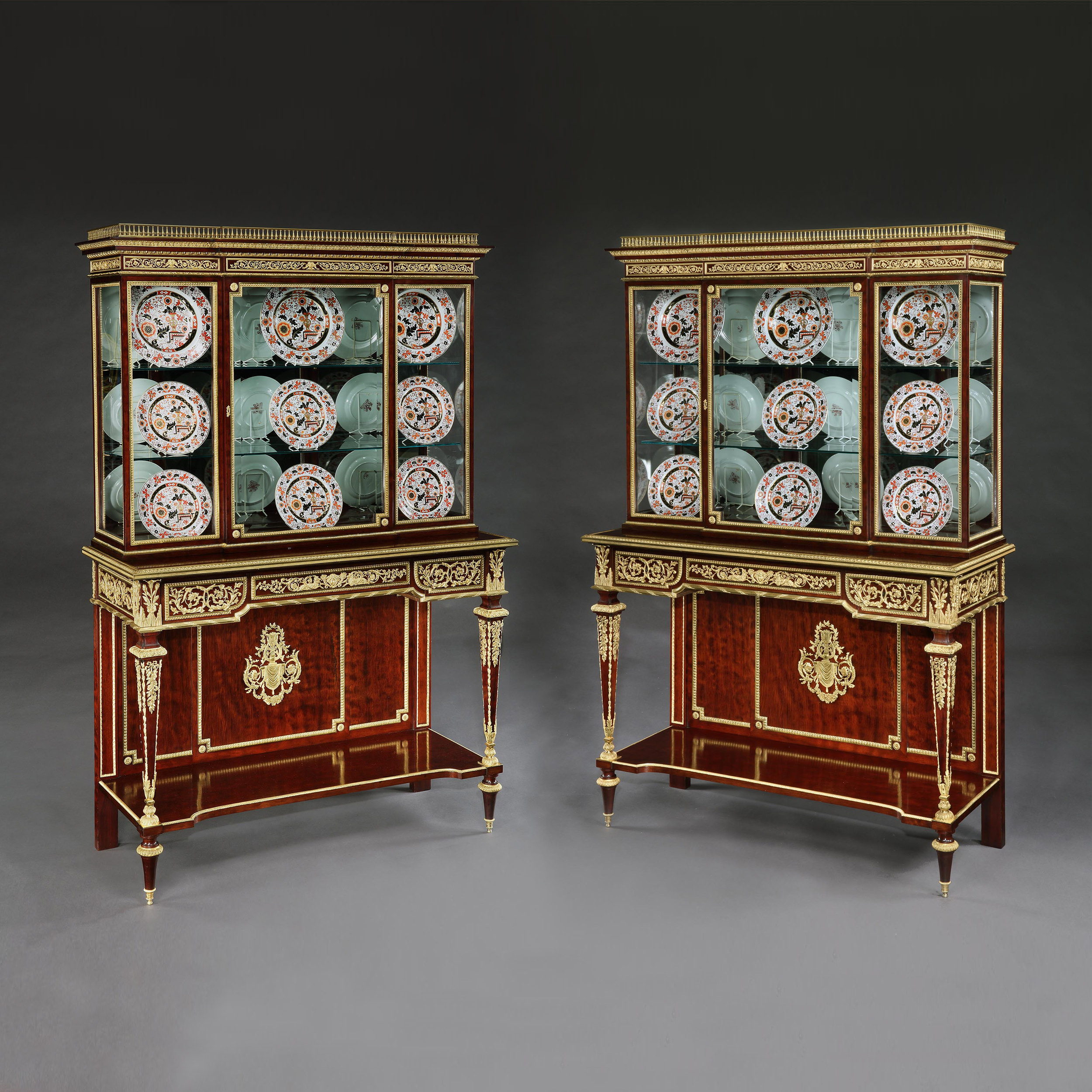 Constructed in mahogany, with extensive and superlative ormolu decoartion. The cabinets of rectangular form, rising from turned and tapering toupie feet supporting an inverted breakfront lower tier, the shaped aprons housing three lockable drawers and incorporating gilt bronze mounts in the manner of Riesener. The square tapering legs decorated in conforming ormolu of the highest quality, and flanking a central cartouche depicting a lyre. The central vitrine lockable doors enclosing shelved mirrored interiors, their pediments decorated with scrolling bronze mounts below ormolu-balustrated galleries. The mounts bearing the maker's mark of Henri Picard, "HPR." Retailed by Wilkinson & Son of 8 Old Bond Street.