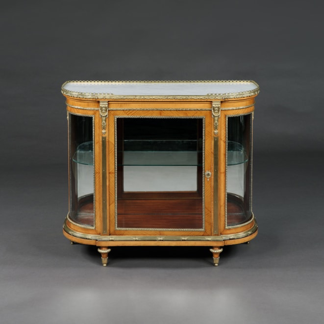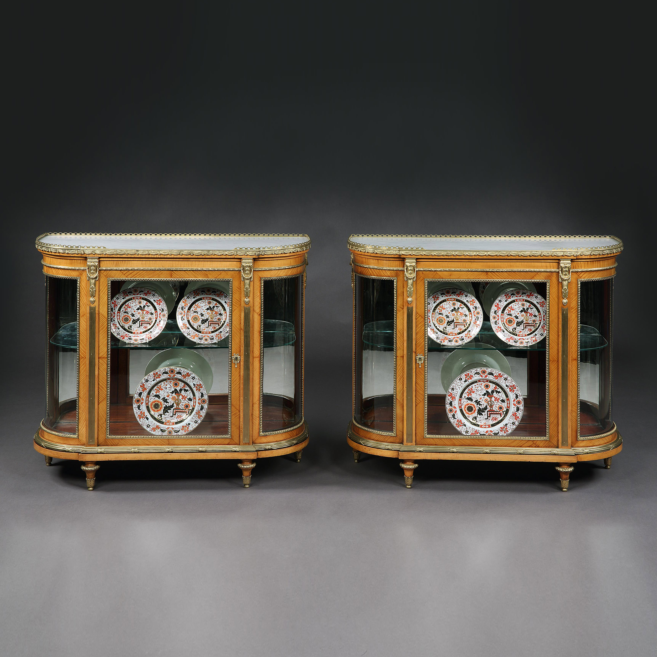 Constructed in fine satin birch, the demi-lune display cabinets having a gentle breakfront form, and rising from toupie feet, the glazed facets enclosed within ormolu stiff leaf moulding, the central lockable doors flanked by brass fluted pilasters; the interiors mahogany lined with a single shelf, and mirrored backs. The whole surmounted by Carrara marble tops with a three-quarter pierced gallery. Stamped "C. Mellier & Co."