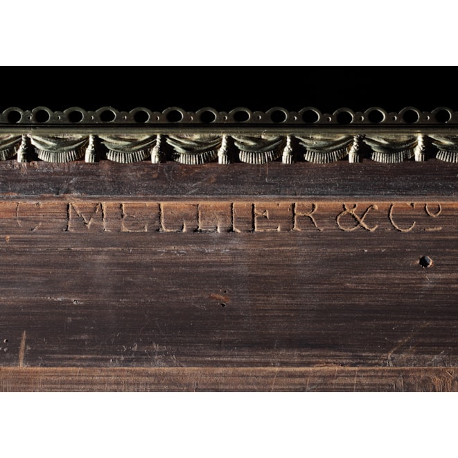 French born, Charles Mellier moved to England, worked for, and eventually took over the illustrious Anglo-French cabinet makers Monbro and Company, circa 1870. Working from Frith Street and later Margaret Street, he soon became a major force in designing and making furniture, and executing grand decorative schemes. The company furnished the great cross- Atlantic liner Mauretania and exhibited at the 1904 International Exhibition in St Louis.