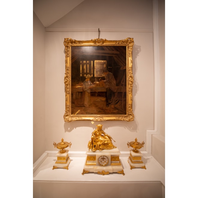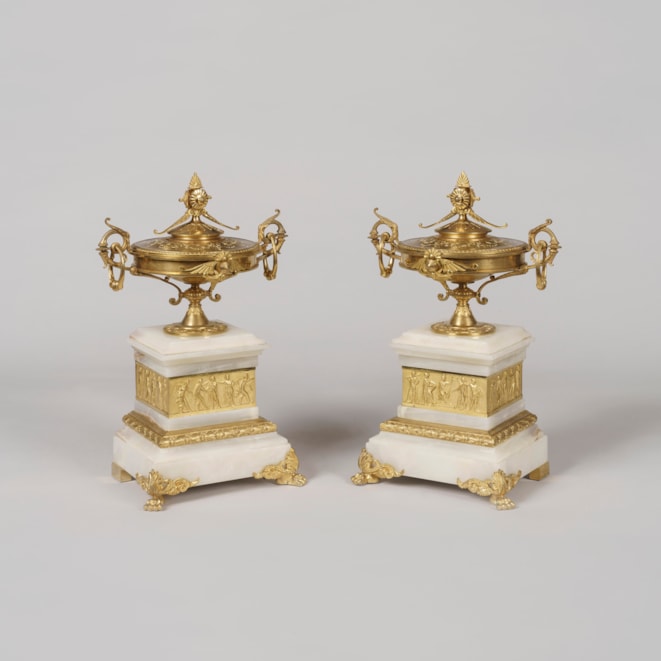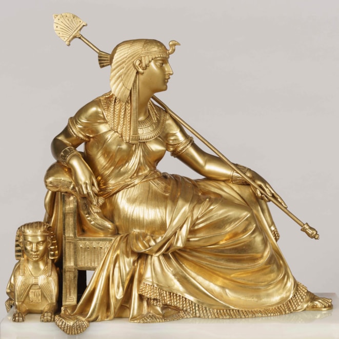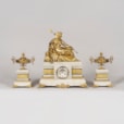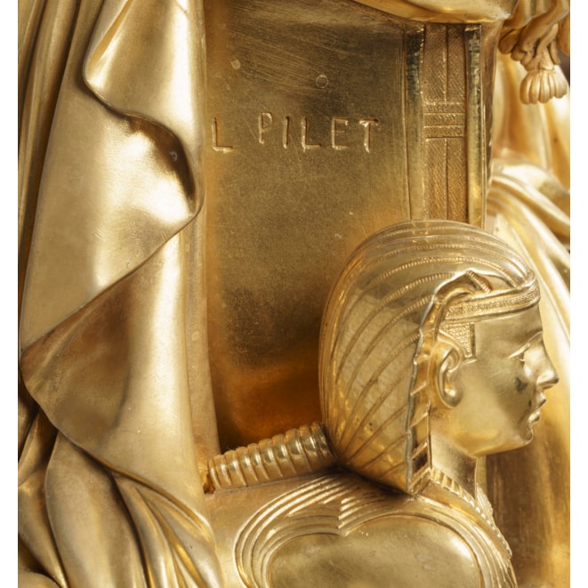 Constructed in Algerian onyx and ormolu, comprising a large clock and two side pieces; rising from winged claw feet, the breakfront clock case having figural ormolu relief borders; the twin train clock, striking on a bell has a circular dial with the hours delineated by Roman numerals; the movement with a Brocourt escapement, the stepped platform having a finely cast and chased figure of a seated Egyptian woman, robed, and formally dressed with the uraeus, symbol of divinity, and holding a spear, with a sphinx to the side, after the original model by Leon Pilet, and signed (1840-1916); the lidded side urns having conforming winged feet, ormolu relief panels.