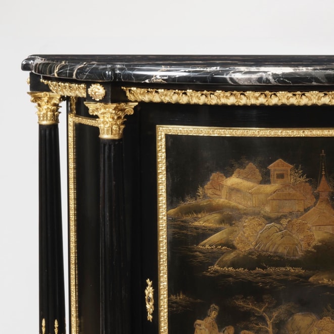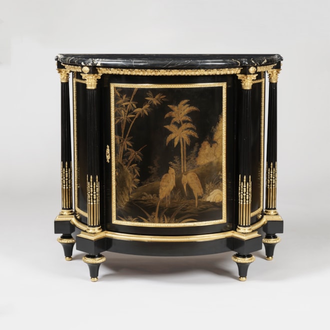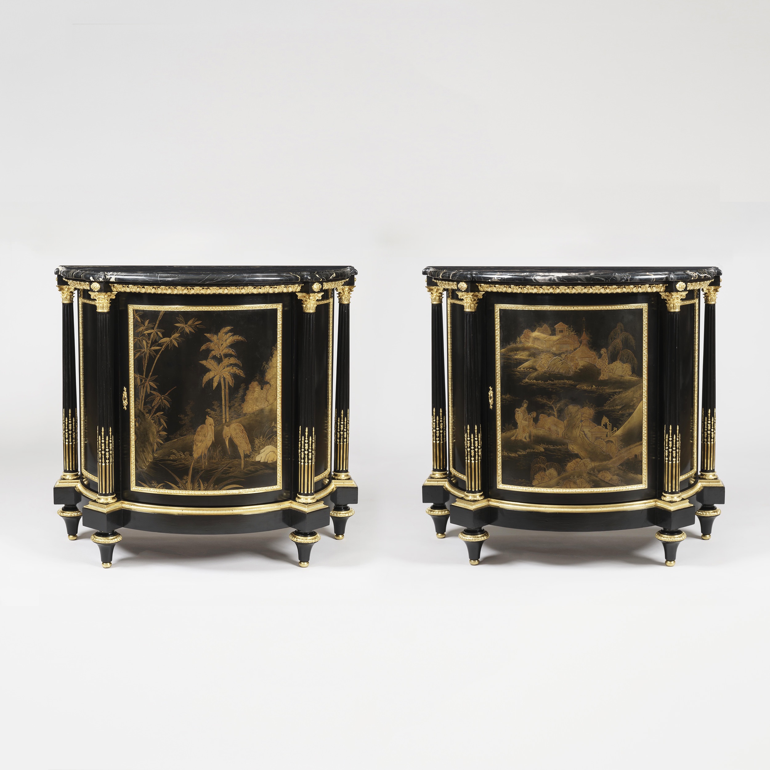 The pair of demi lune cabinets constructed from bois noirci, rising from tapering toupie feet, the curved front inset with fine imported Japanese lacquer panels and flanking blind panels with conforming stiff-leaf ormolu moulding, the Portor marble tops of slight overhang supported by four fluted Corinthian columns dressed with fine gilt bronze capitals. One of the mounts incised "M. B." to the back referring to Blaise Millet, the founder of Maison Millet.