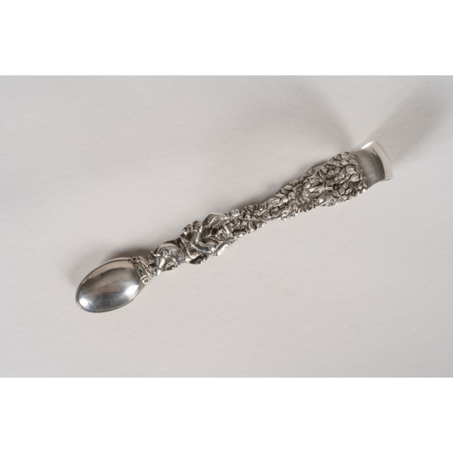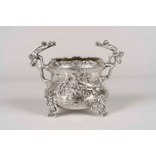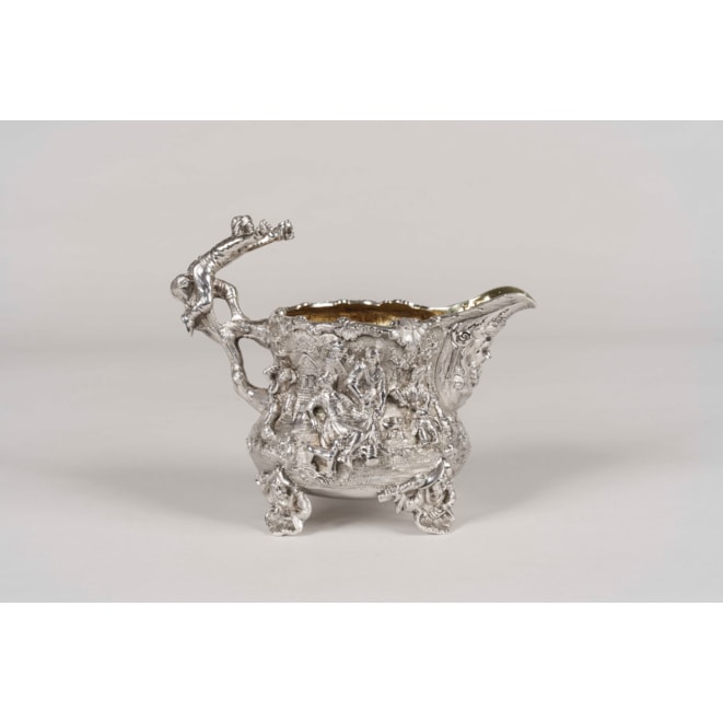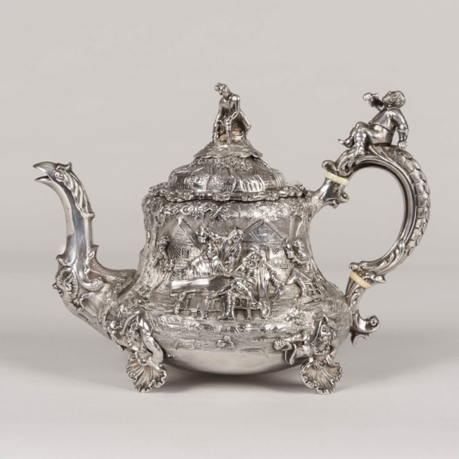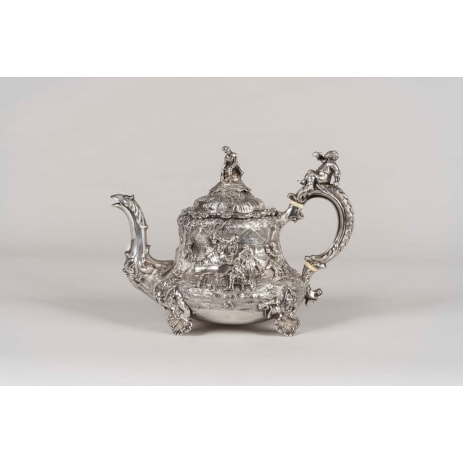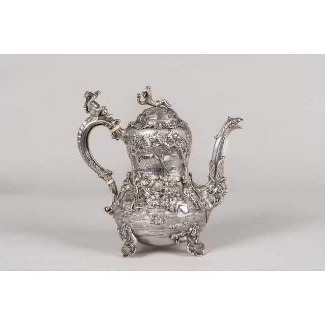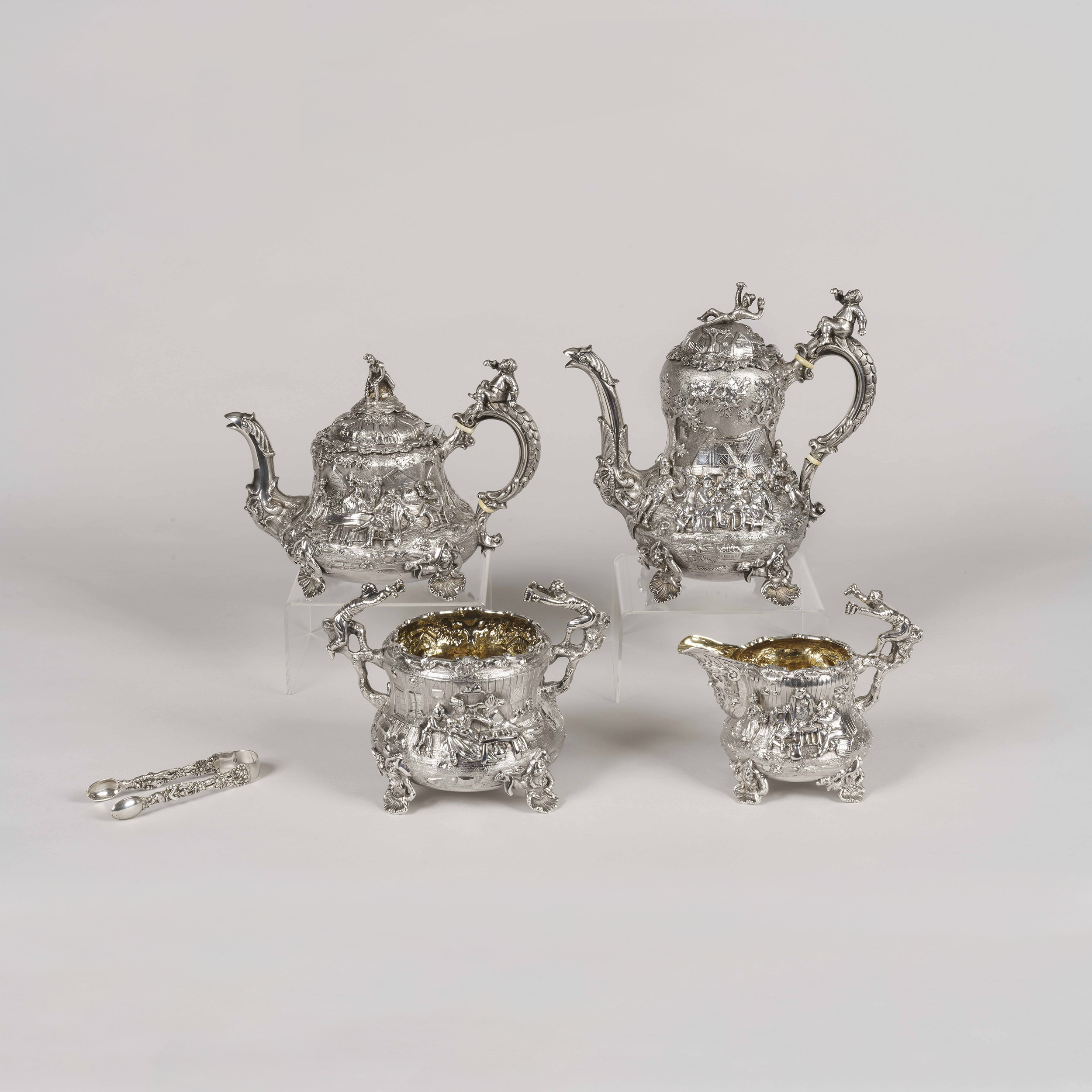 Assayed in London in 1852/3, the solid silver 4-piece service in the manner of Edward Farrell decorated in high relief with scenes of merry-making and tavern interiors in the style of David Teniers. The handles and lids having free-standing jovial figures perched atop. Each piece bearing the maker's mark of Joseph Angell as well as the retailer's mark of "Thomas's of Bond Street." With later associated solid silver sugar tongs. The whole set housed within an oak box marked "Goldsmiths Alliance Limited." Several pieces by John Angell dated to the mid-19th century are in the permanent collection of the Victoria & Albert Museum.