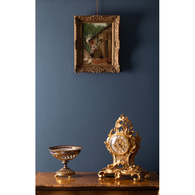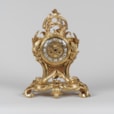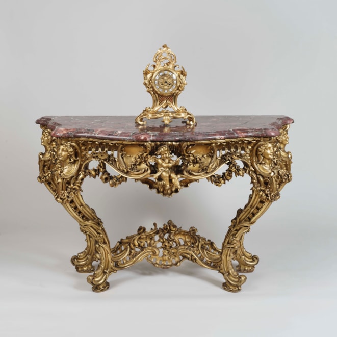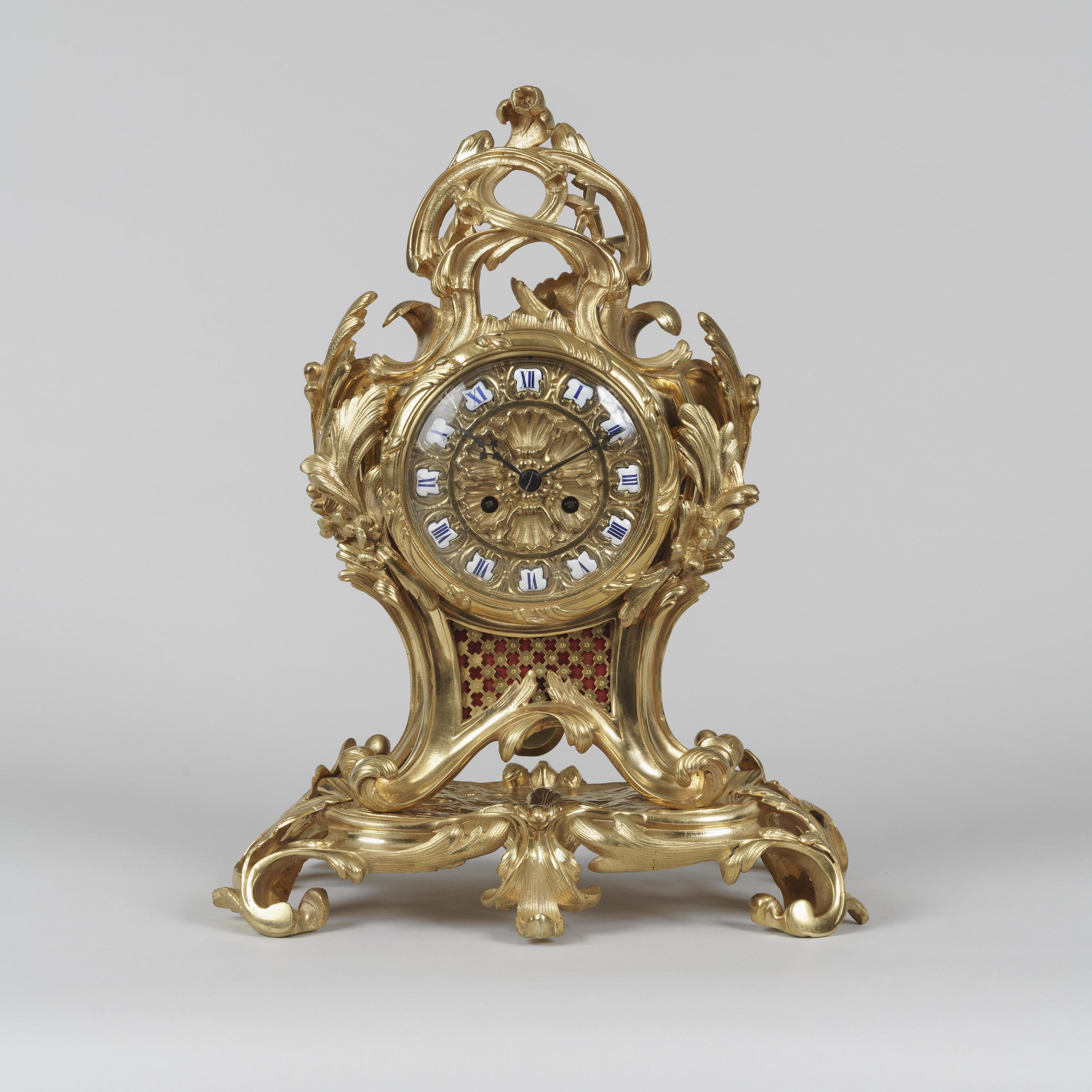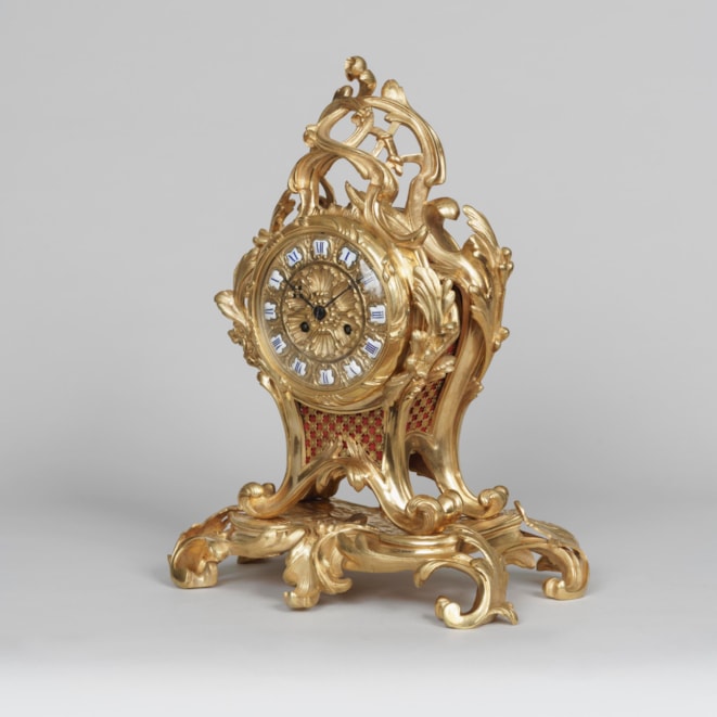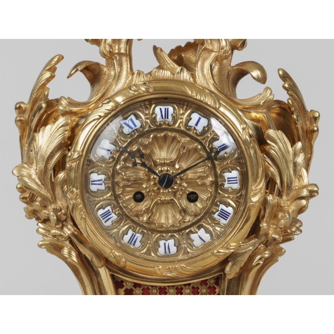 The clock and its plinth executed in gilt bronze in a dynamic rococo style, rising from scrolling foliage, the dial in the shape of a flower and having the hours marked by hand-painted porcelain roman numerals; flanked by scrolling acanthus and foliage with an intertwined foliate pinnacle. The eight-day movement striking on the hour, and half hour.