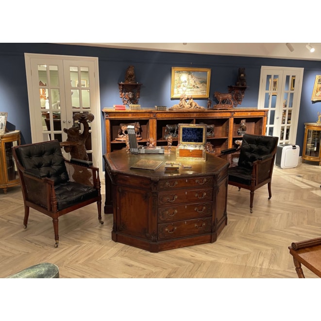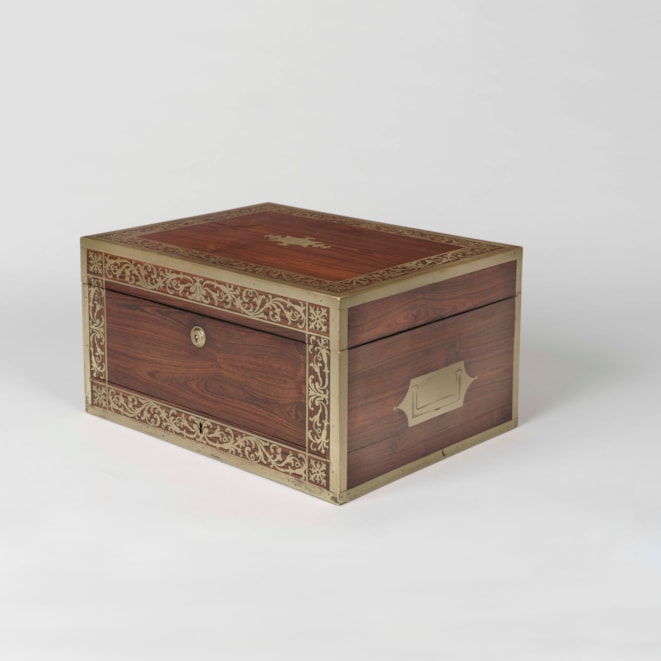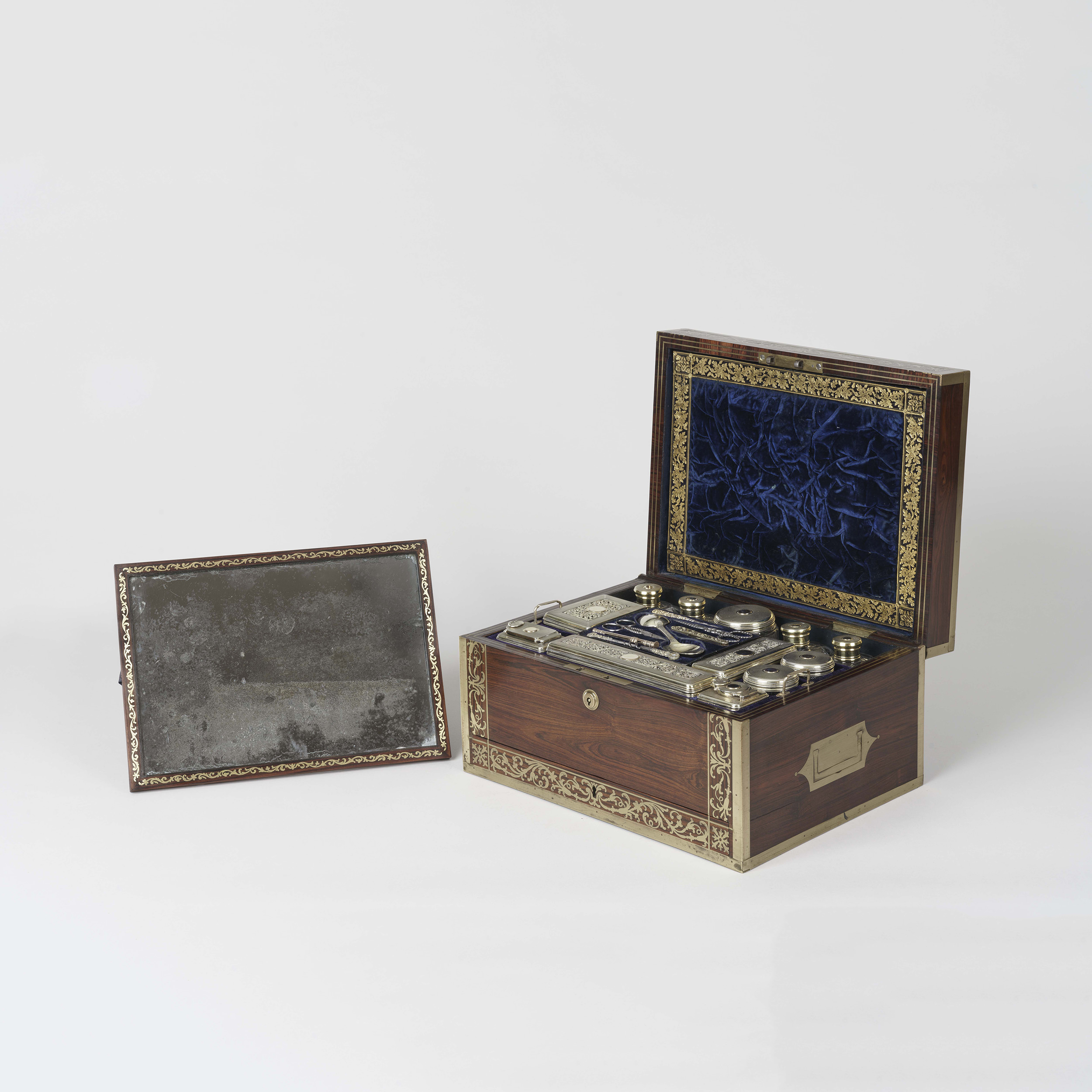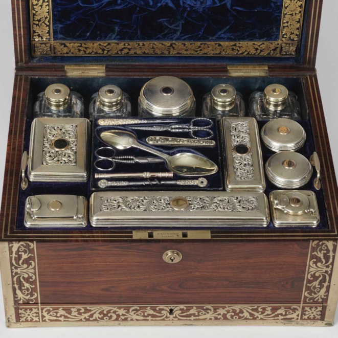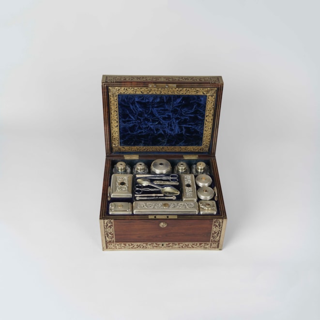 The case is constructed in a finely figured rosewood, with inset brass handles, and fine brass arabesque inlay. The hinged lid bearing the initials “S.A.V” rises to reveal in the upper section, a drop down document holder with embossed maker’s label and a removable mirror to the back; the silver pieces comprise a suite of five cut glass jars, and various other accoutrements including a toothbrush holder and makeup vials, the lift out platform with storage below; a lockable velvet-lined drawer is situated below the bramah lock escutcheon. The sterling silver bearing the marks for John & Archibald Douglas and dated 1825. The box bearing the retailer’s label of John Corfield.