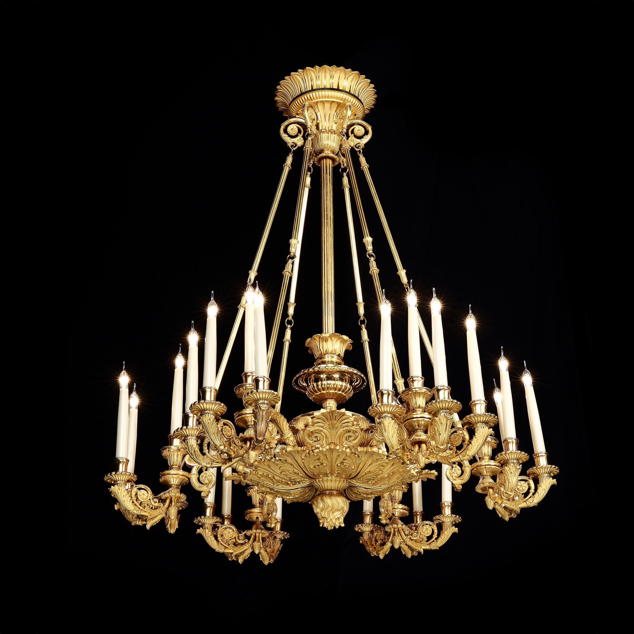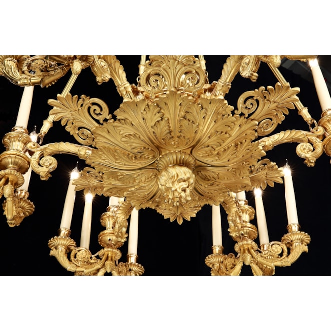 Constructed in bronze, which has been cast with extraordinary attention to detail, and conformingly excellent planishing, burnishing, and two colour mercury gilding; the central dish of acanthus form having a suspended flambé finial, the six scrolling branches of foliate form each issuing three branches of conforming design with pine cone finials and lotus nozzle drip pans; interspersed by large extending anthemion mounts; the central reeded stem rising from a lobed urn finial and terminating with a scrolling lotus corona with six decorative suspension rods.