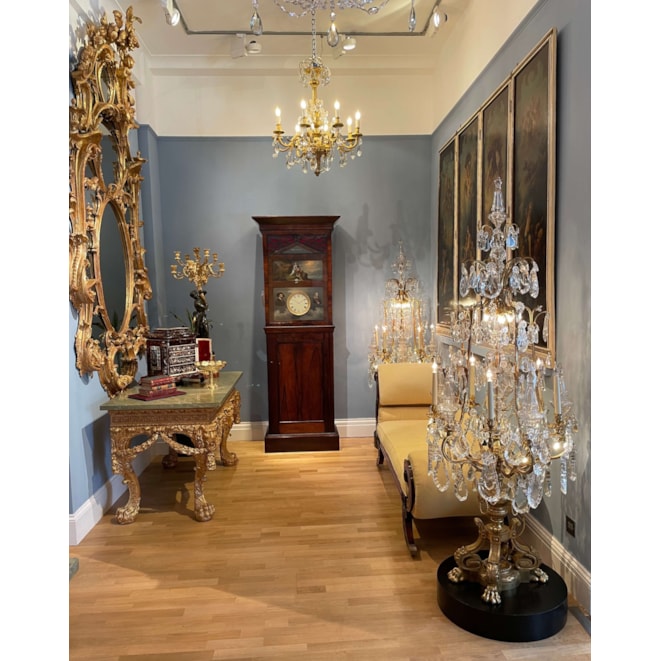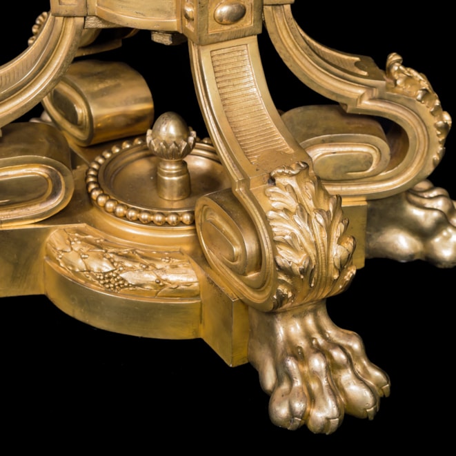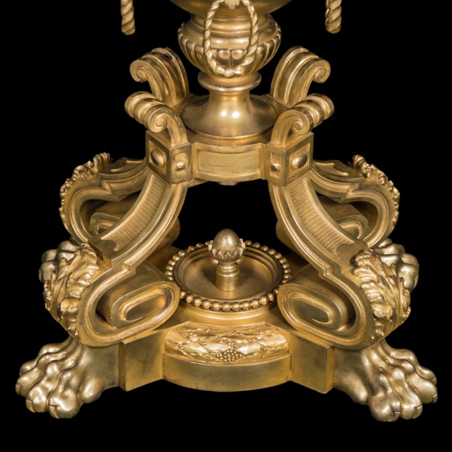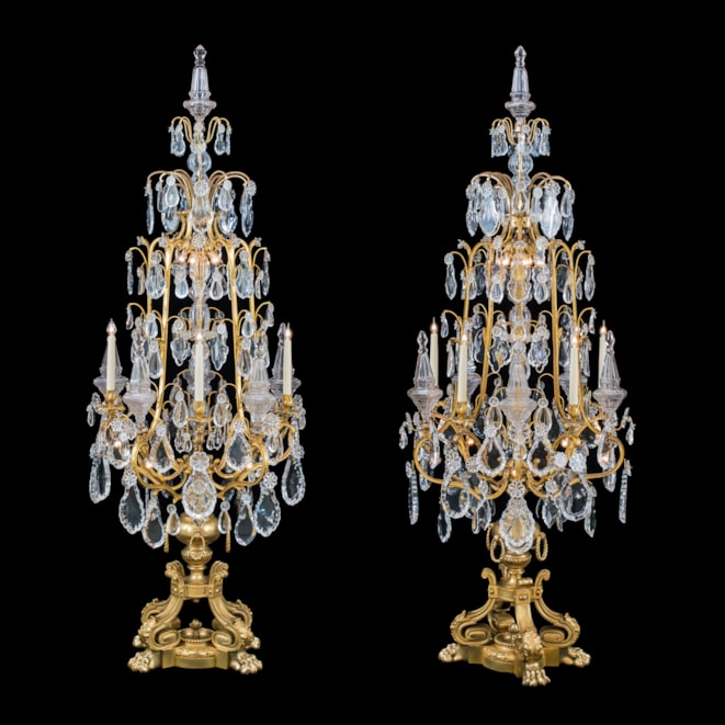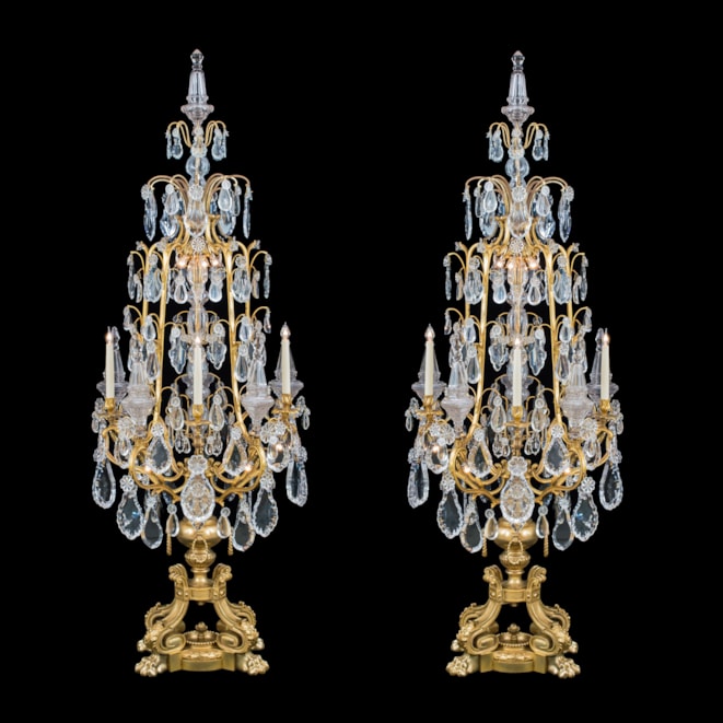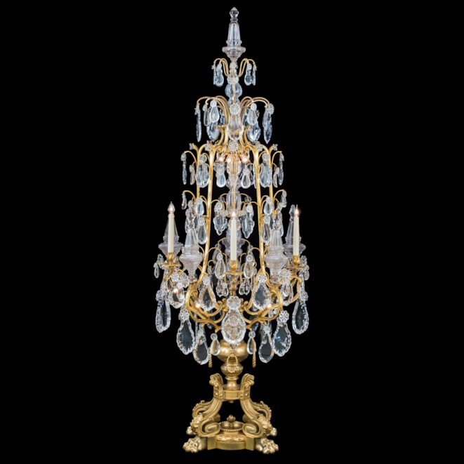 Constructed from finely cast and chased ormolu, the imposing floor candelabra—almost 2-meters tall—are supported on four lion’s paw feet surrounding a central finial and concentric laurel leaves with acanthus scrolls, supporting the main branchwork, composed of five arms dressed with a myriad of French crystal drops, rosettes, and obelisks. Fitted for electricity: five candles each and additional filament bulbs.