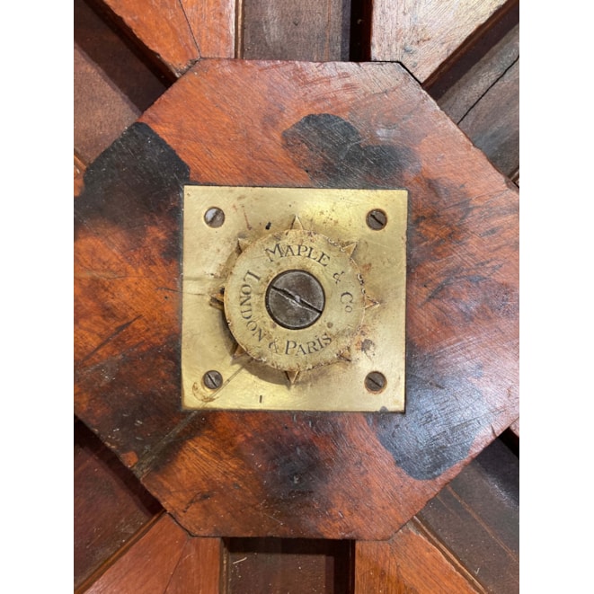 Constructed in mahogany, rising from four 'lions paw' feet, which support four reeded and stop fluted columns, having a conjoining stretcher of 'X' form; closed, the table is 66 inches diameter, but, when the ingenious capstan action is operated, the frame opens to receive one of two sets of different sized eight segment-form leaves, enabling the diameter to be increased to a maximum diameter of 96 inches. Stamped Maple & Co, London & Paris."
