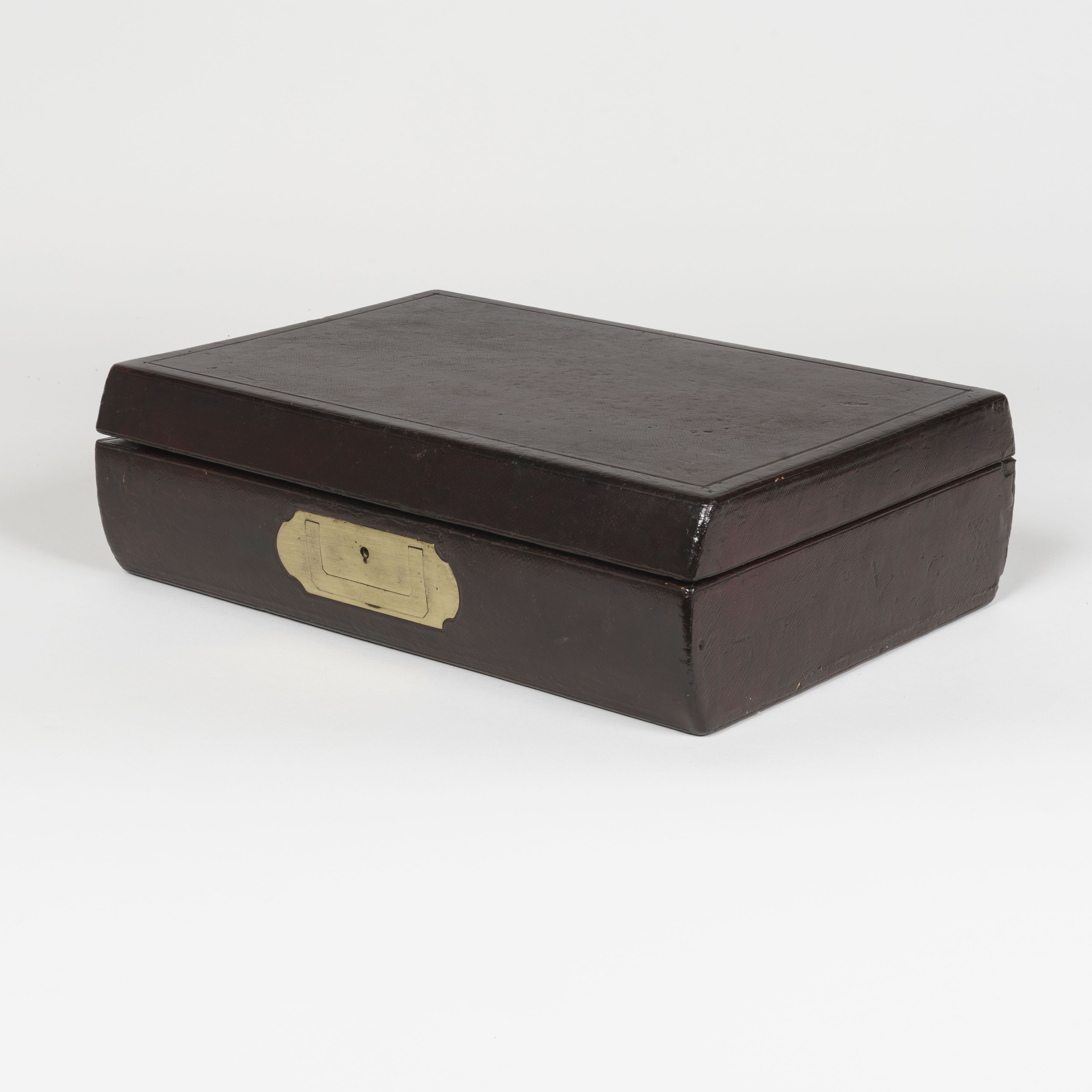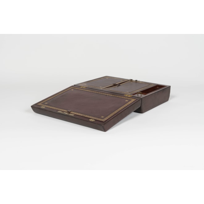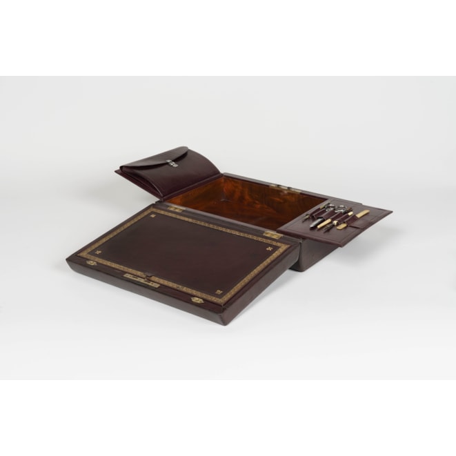 Of the very highest quality, the carcass constructed from Cuban flame mahogany; the lockplate of shaped elliptical escutcheon form (and bearing stamps to the interior, 'London' & 'RS'), and housing an inset carrying handle; the gilt tooled Morocco leather interior houses a stationery division, the lower section opening to reveal a fitted interior with writing implements; to the left, a pencil tray, and a self-sealing inkwell marked with the patent of ‘H. Webster, London’.