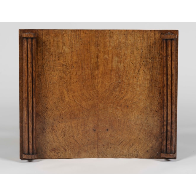 Constructed from indigenous oak--a wood typically used by the renowned cabinetmaker George Bullock--this stool of elegant proportions supported on x-frame supports carved with lotus ends and joined by a baluster stretcher. The dished seat with reeded cylinder terminals.