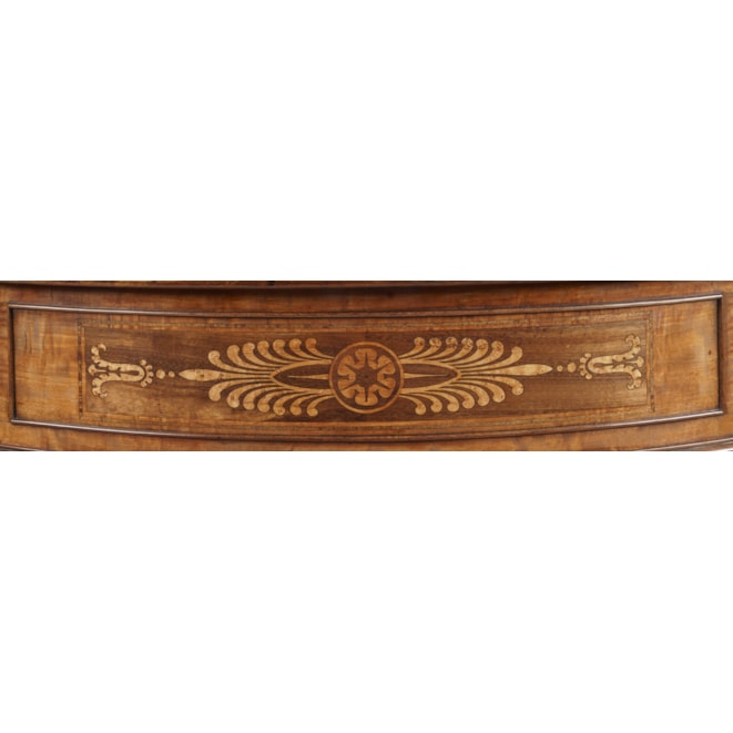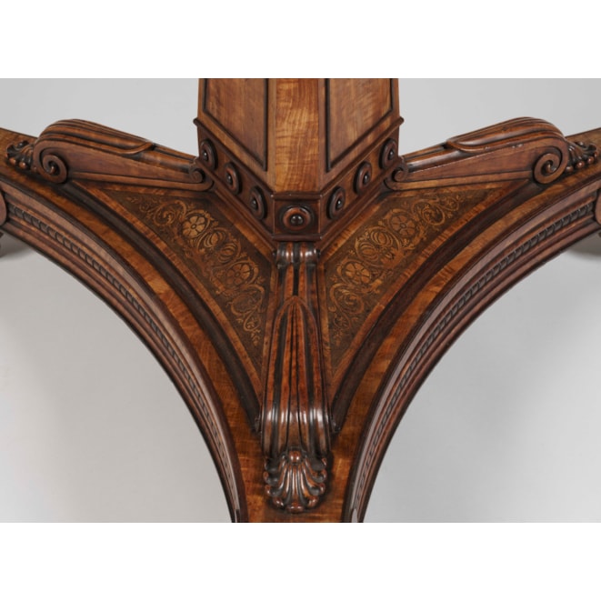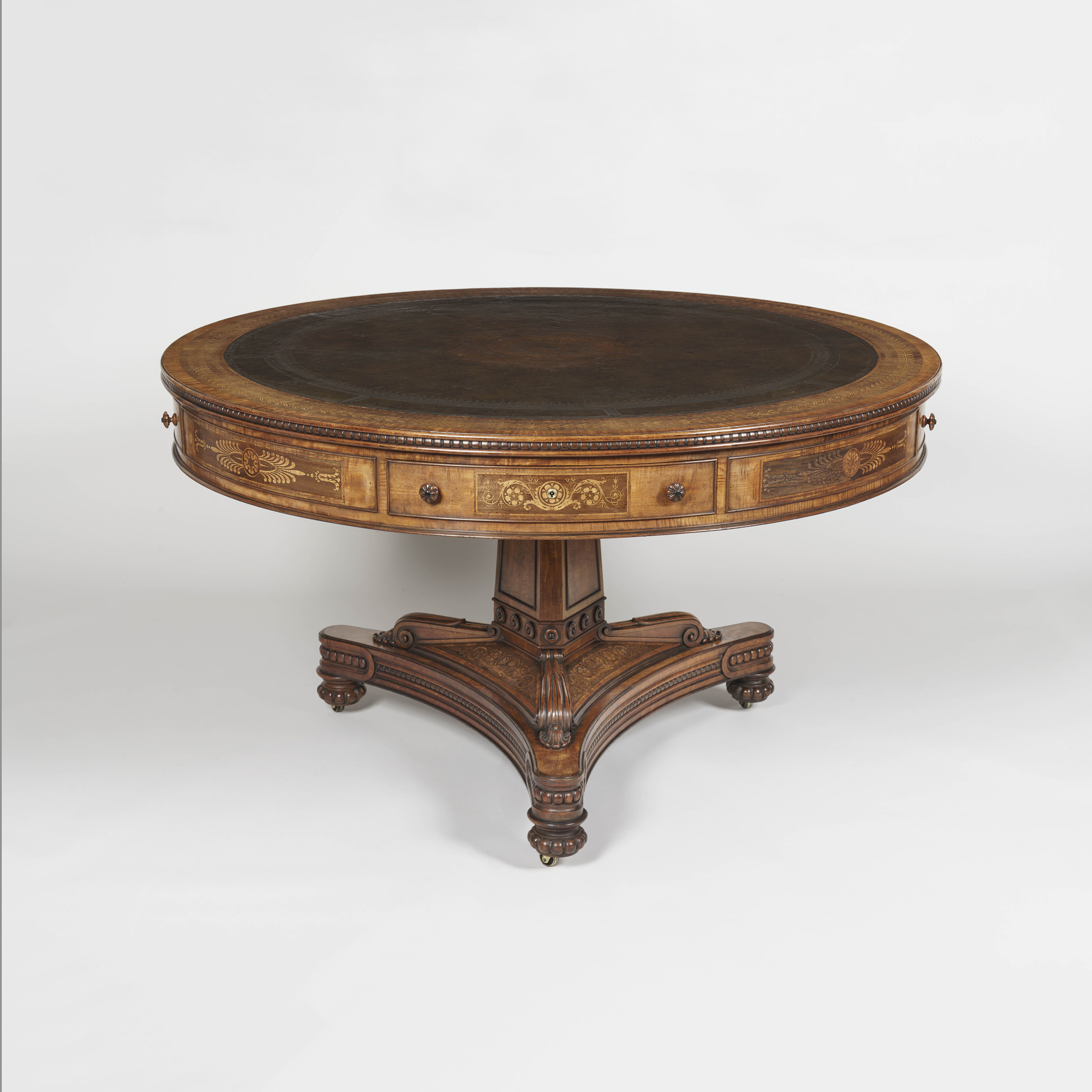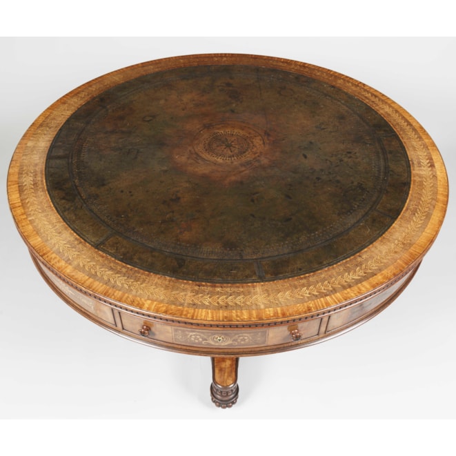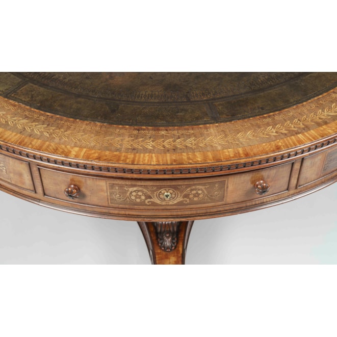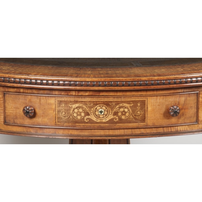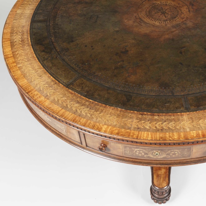 Constructed from Honduras mahogany and inlaid with satinwood marquetry, the circular table supported on a tripartite base with gadrooned oblate bun feet concealing castors, variously inlaid with floriate patterns, the central pillar dressed with turned discs, supporting the revolving top exhibiting a laurel banded edge and a tooled Moroccan leather top; below, the frieze inlaid in conforming style and fitted with four drawers each with a lockable Bramah patented mechanism.