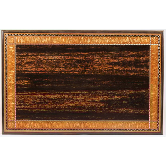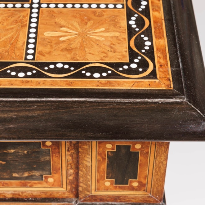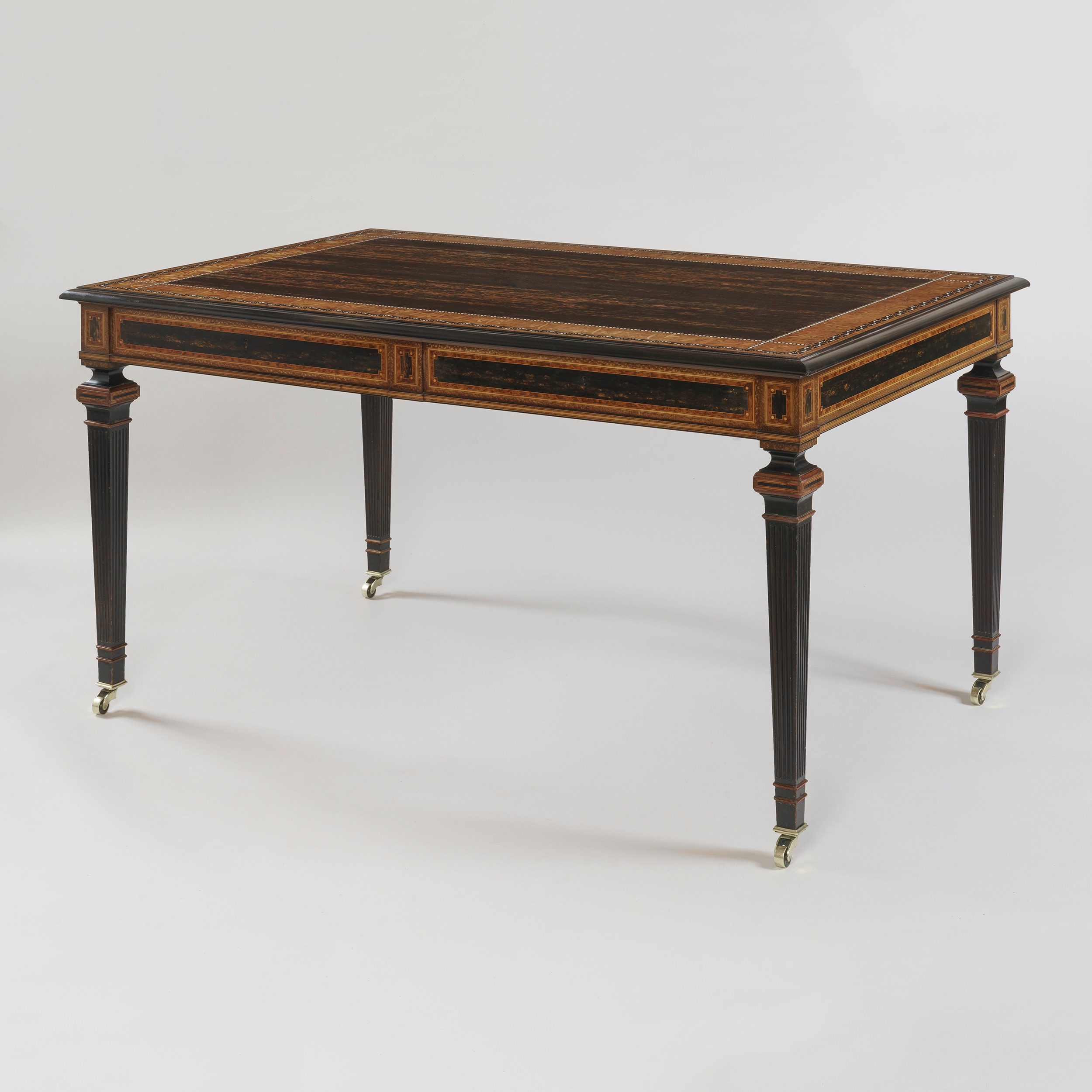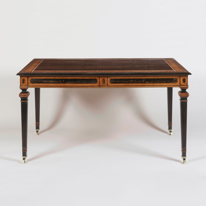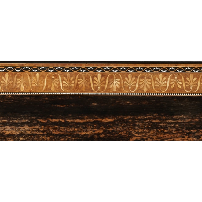 Of free standing rectangular form, constructed in coromandel, with inlays in thuya, ebony, boxwood, honeysuckle and ivory; the fluted legs rising from square brass castor-shod feet; the frieze housing two lockable drawers fitted with rare ‘tamper proof’ Chubb locks and having quadrant moulded cedar lined interiors; the platform having a central panel of beautifully chosen matched coromandel veneers, with an outer guard border of a running pattern of stylised anthemions; the ebony edges having a thumb nail moulding.