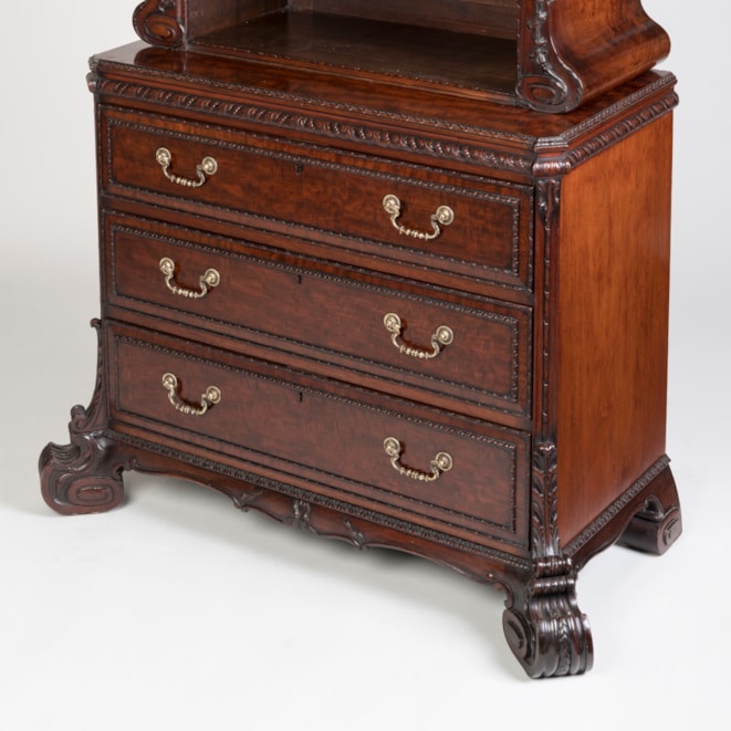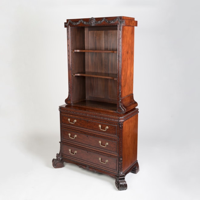 Designed in the neo-classical fashion pioneered by Thomas Chippendale, the mahogany cabinet bookcase is crisply carved throughout, rising from voluminous scrolling supports; the canted sides with acanthus leaf carved decoration and flanking the lockable graduated drawers with brass swan neck handles, the superstructure rising from scrolls in conforming style and enclosing a three-shelved upper cabinet; the cornice applied with carved floral garlands and a central lion’s mask. Stamped to the rear 'H. Samuel, 484 Oxford Street W'.