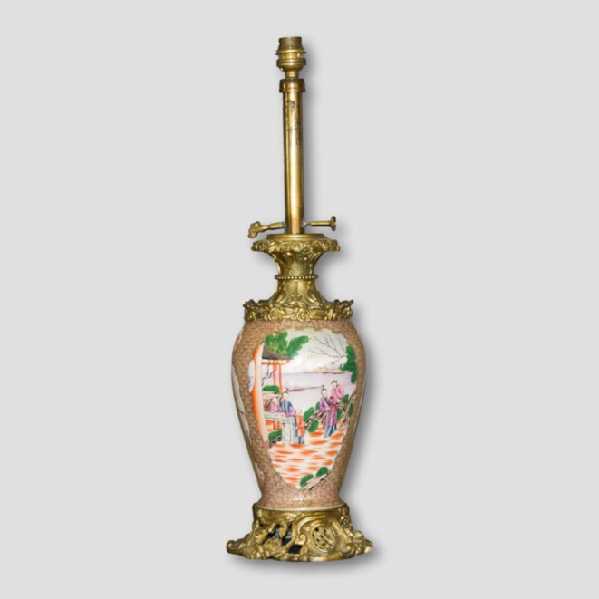 Hand painted in the 'Mandarin' palette - the polychromes depicting court and genre scenes, mounted on gilt bronze rococo bases