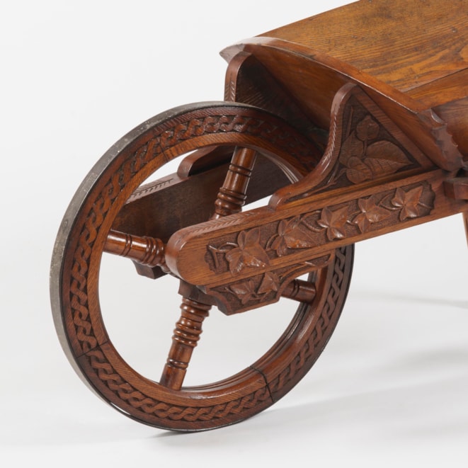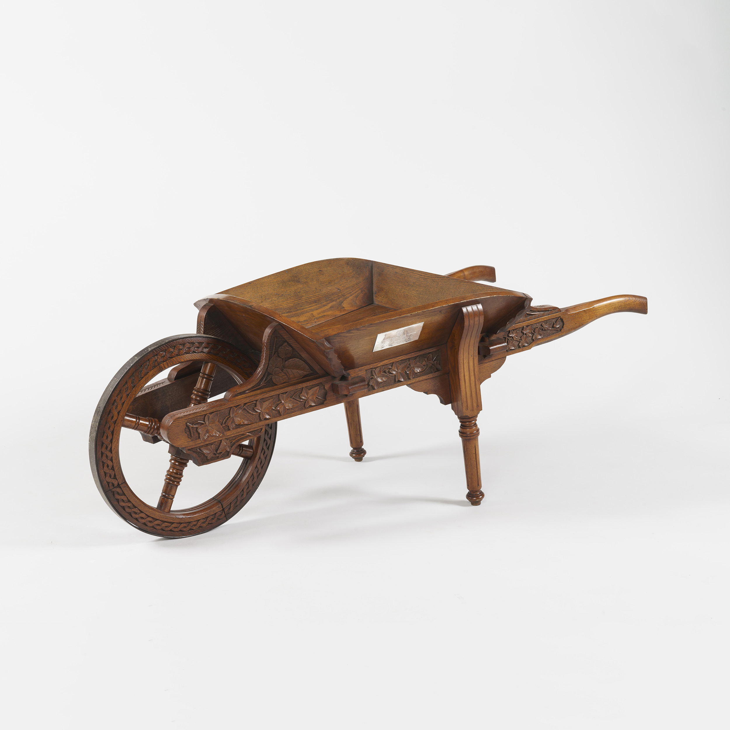 The presentation wheelbarrow carved from oak with finely carved ivy leaves and foliage adorning the frame, the front wheel with turned spokes and a guilloche-carved rim. Bearing a silvered plaque commemorating the start of construction: