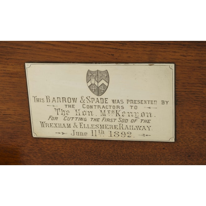 “This Barrow […] was presented by the contractors to The Hon. Mrs Kenyon for cutting the first sod of the Wrexham & Ellesmere Railway. June 11th 1892.”