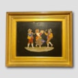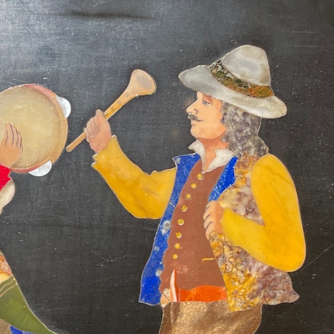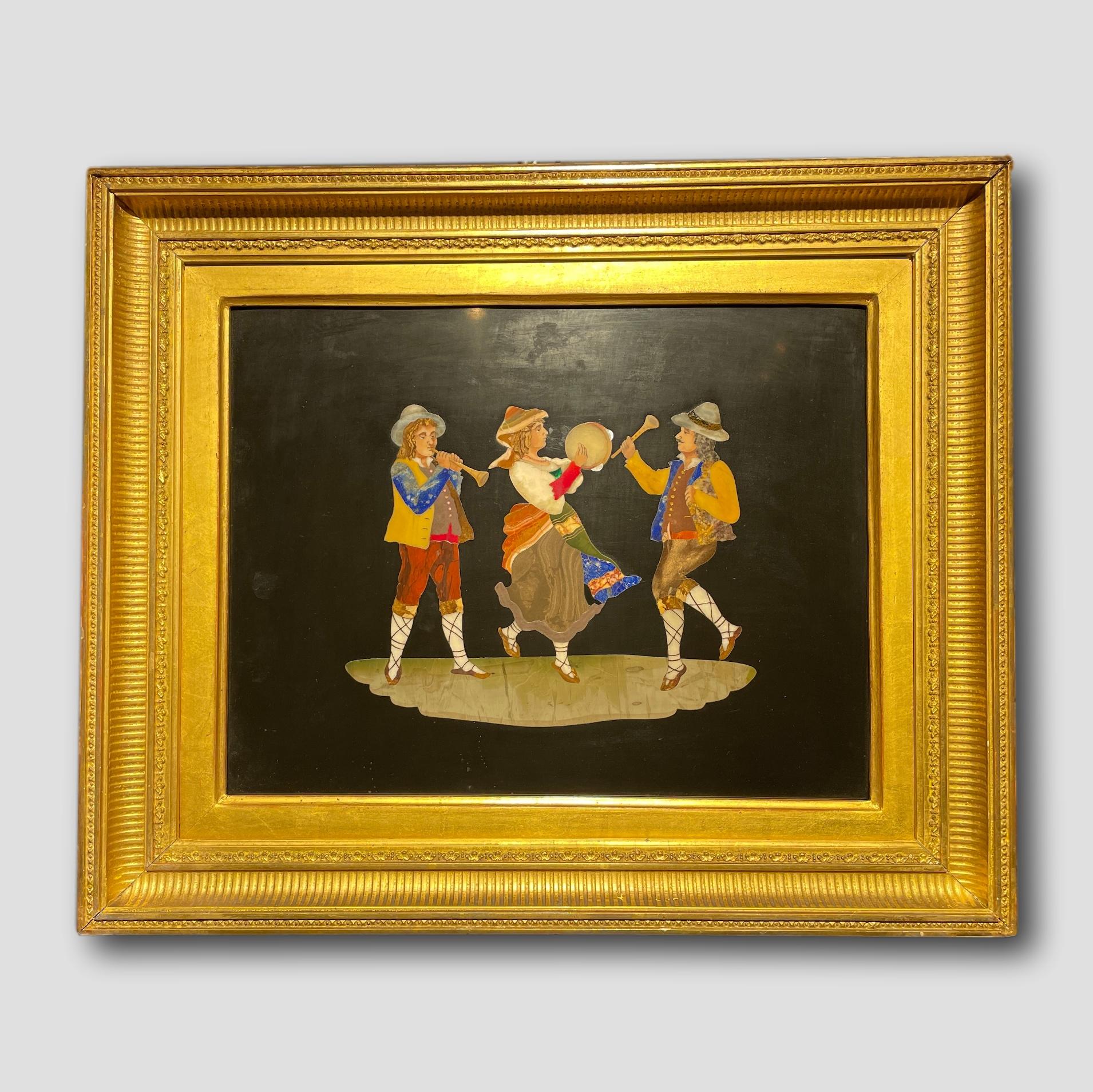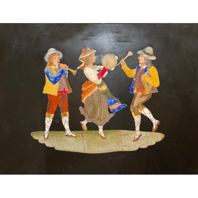 Set into a black slate ground, the hardstones include Lapis Lazuli, Yellow Sienna, Sicilian Jasper and Breccia Rosso, and portray three Italian musicians, the men cross gartered, and playing pipes, the female with a tambourine.