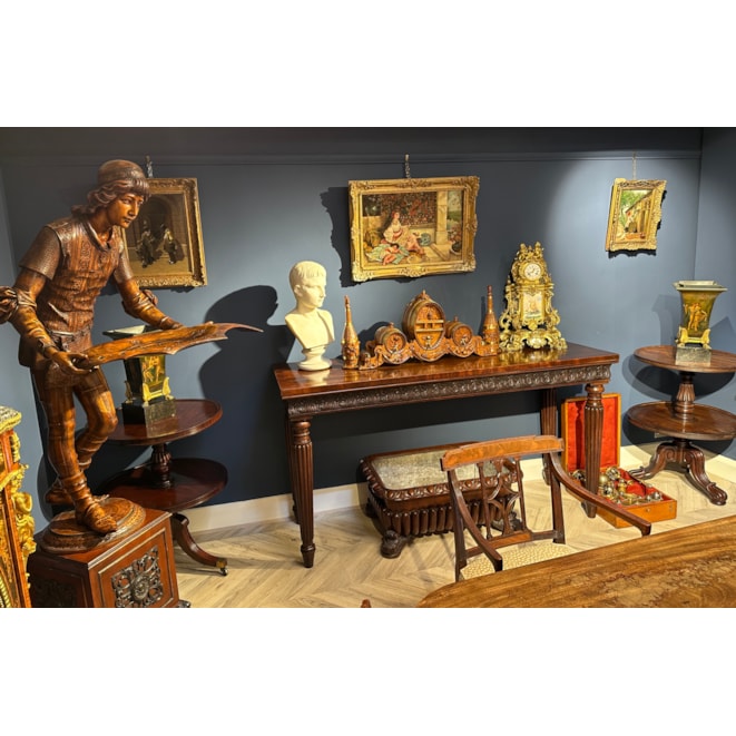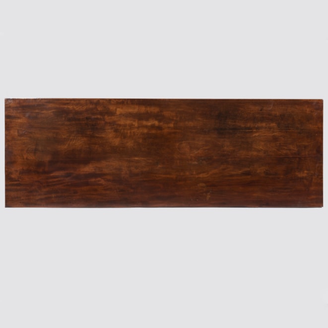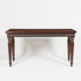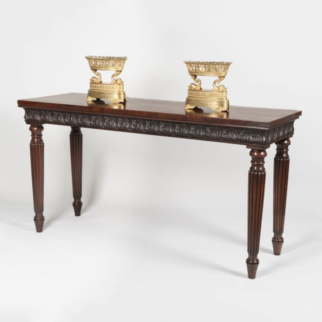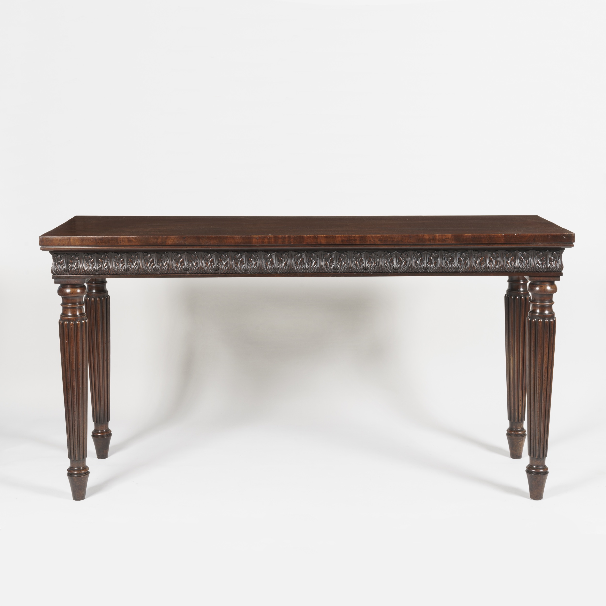 Constructed from richly patinated mahogany, the rectangular serving table rising from turned and tapering reeded legs; the top supported by a carved acanthus & lotus running frieze.