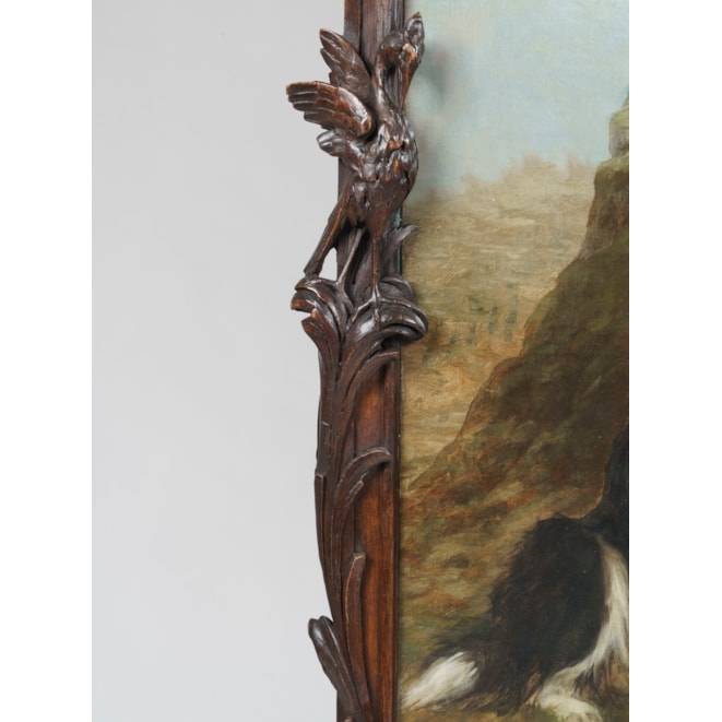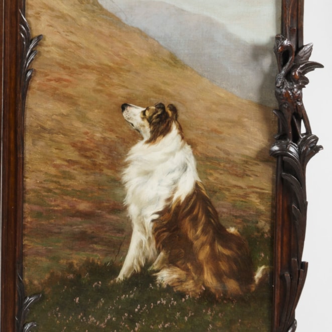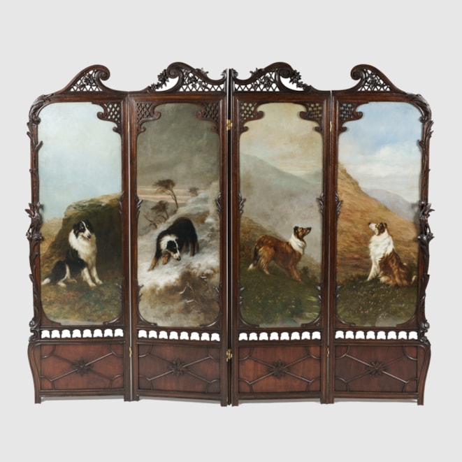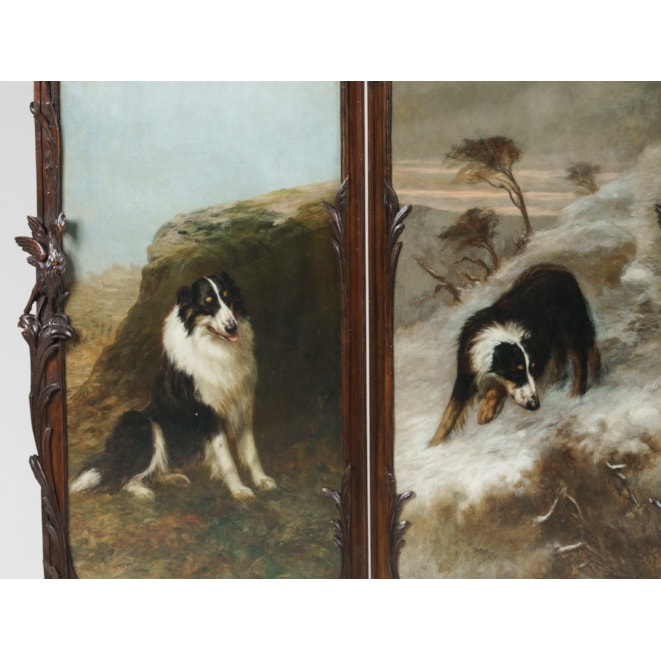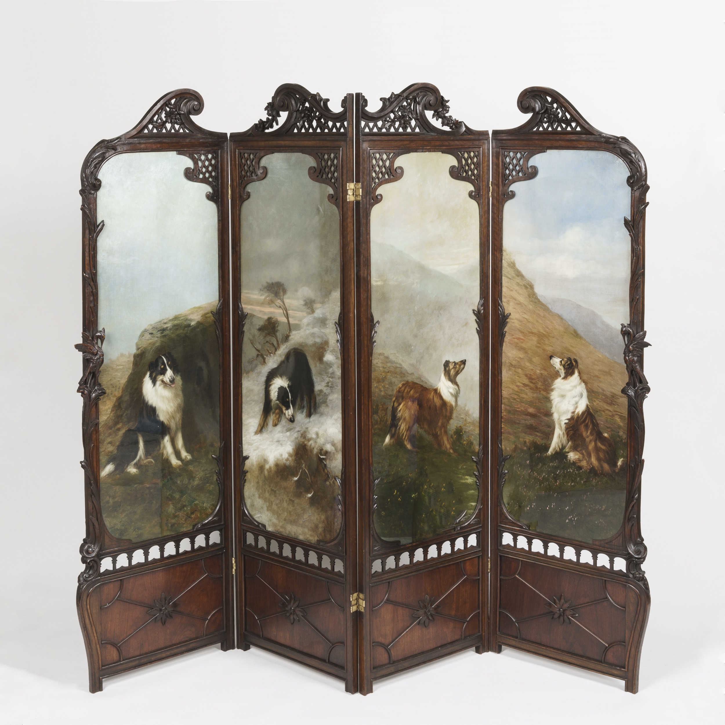 The screen of rounded rectilinear form and constructed from mahogany, with two pierced broken swan-neck pediments atop, with carved flora and fauna throughout inspired by Art Nouveau, the lower register with relief-carved paterae; the four panels executed in oil on canvas in the celebrated finesse and realism associated with Maud Earl, depicting Collies. Each panel signed by the artist.