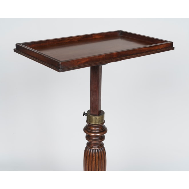 Carved from mahogany, the tables supported on fluted and splayed legs with carved ball feet, the turned and reeded baluster-shaped stems of adjustable height having rectangular lipped platforms.