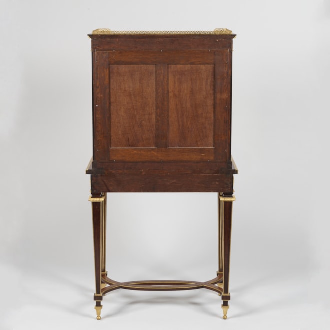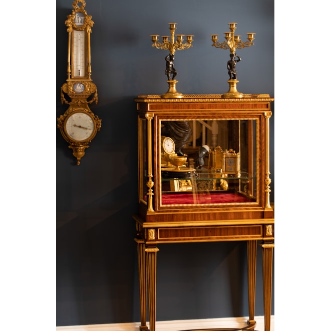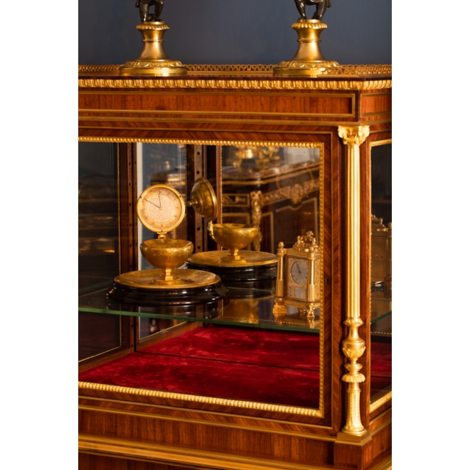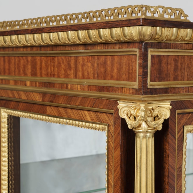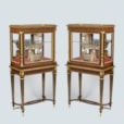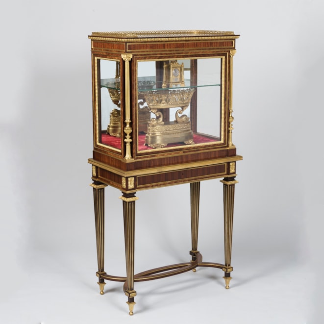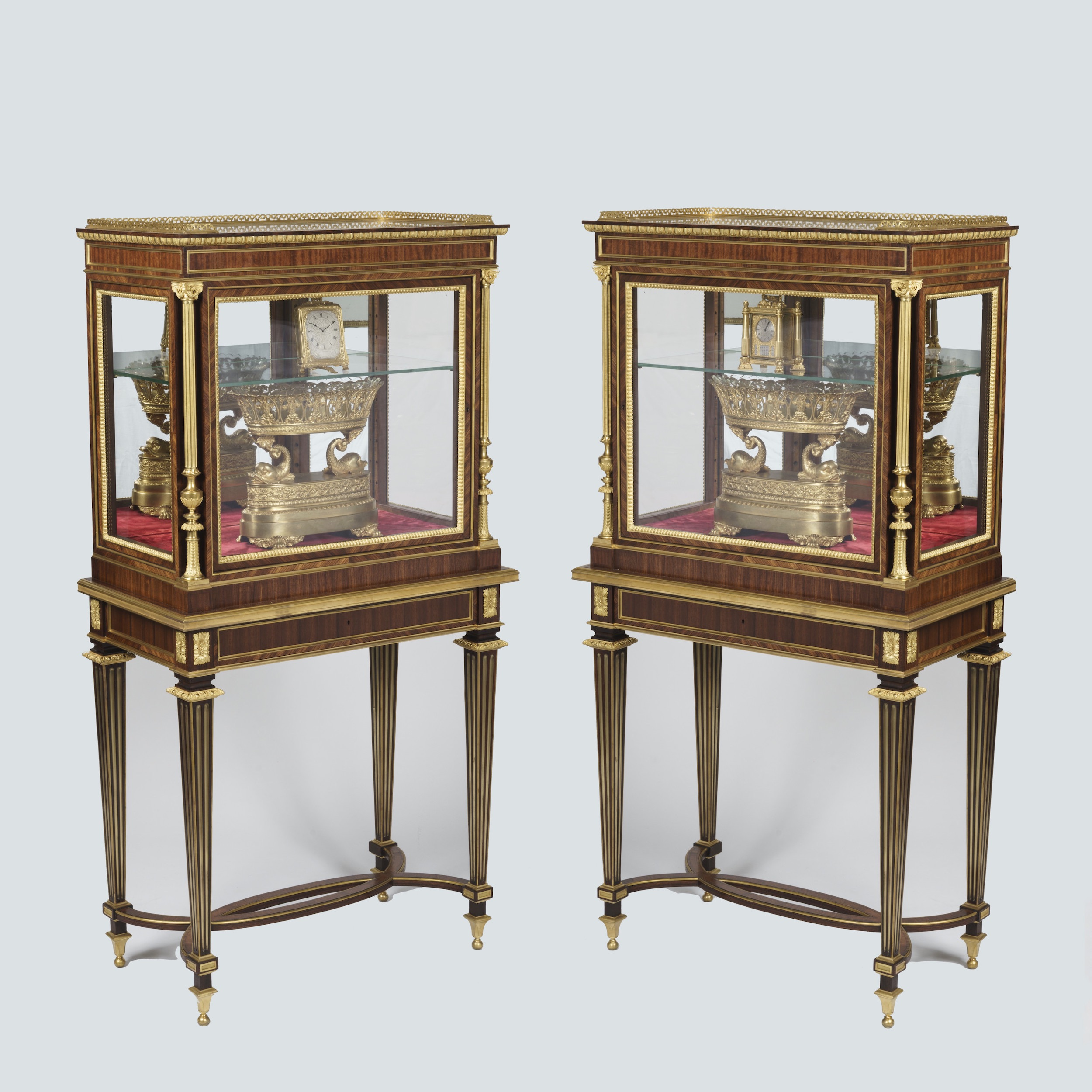 Constructed from kingwood and bois satiné with ormolu mounts throughout, each cabinet supported on tap9624ering square fluted legs with looped stretchers, the corners of the apron dressed with gilt bronze rosettes and housing lockable drawers, the superstructure glazed on the front and sides within book-matched borders and fluted ormolu columns to the corners, a lockable door enclosing the interior with an adjustable shelf; the top glazed in conforming manner with a three-quarter pierced gallery.