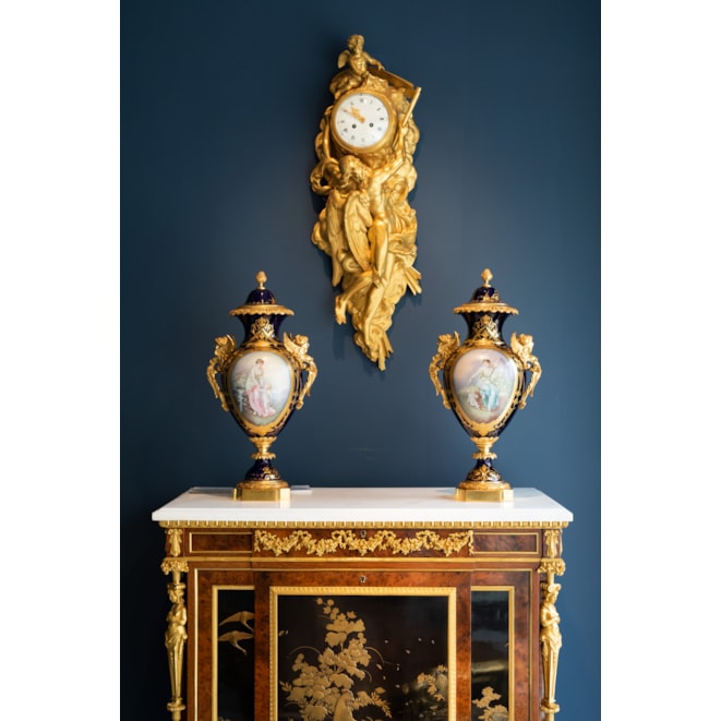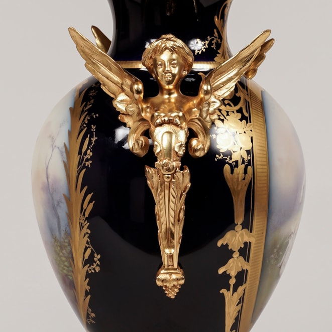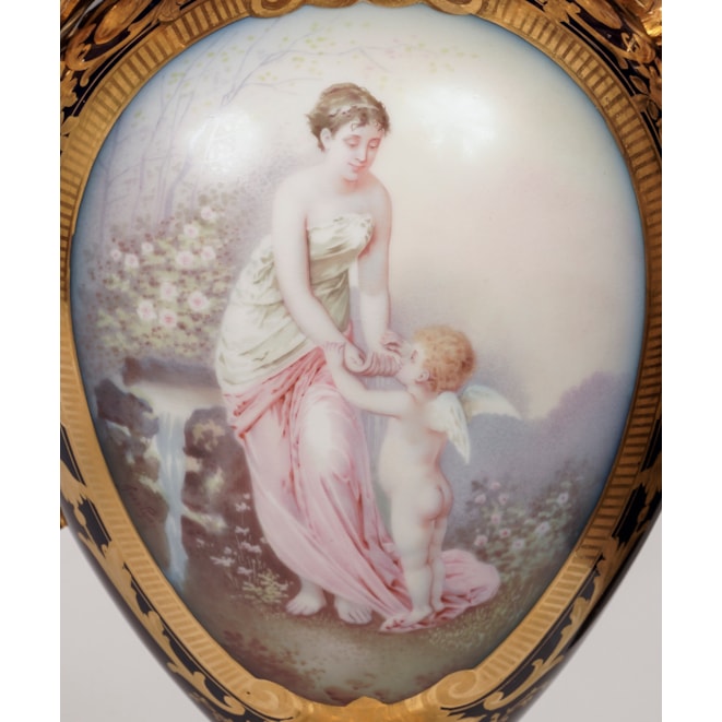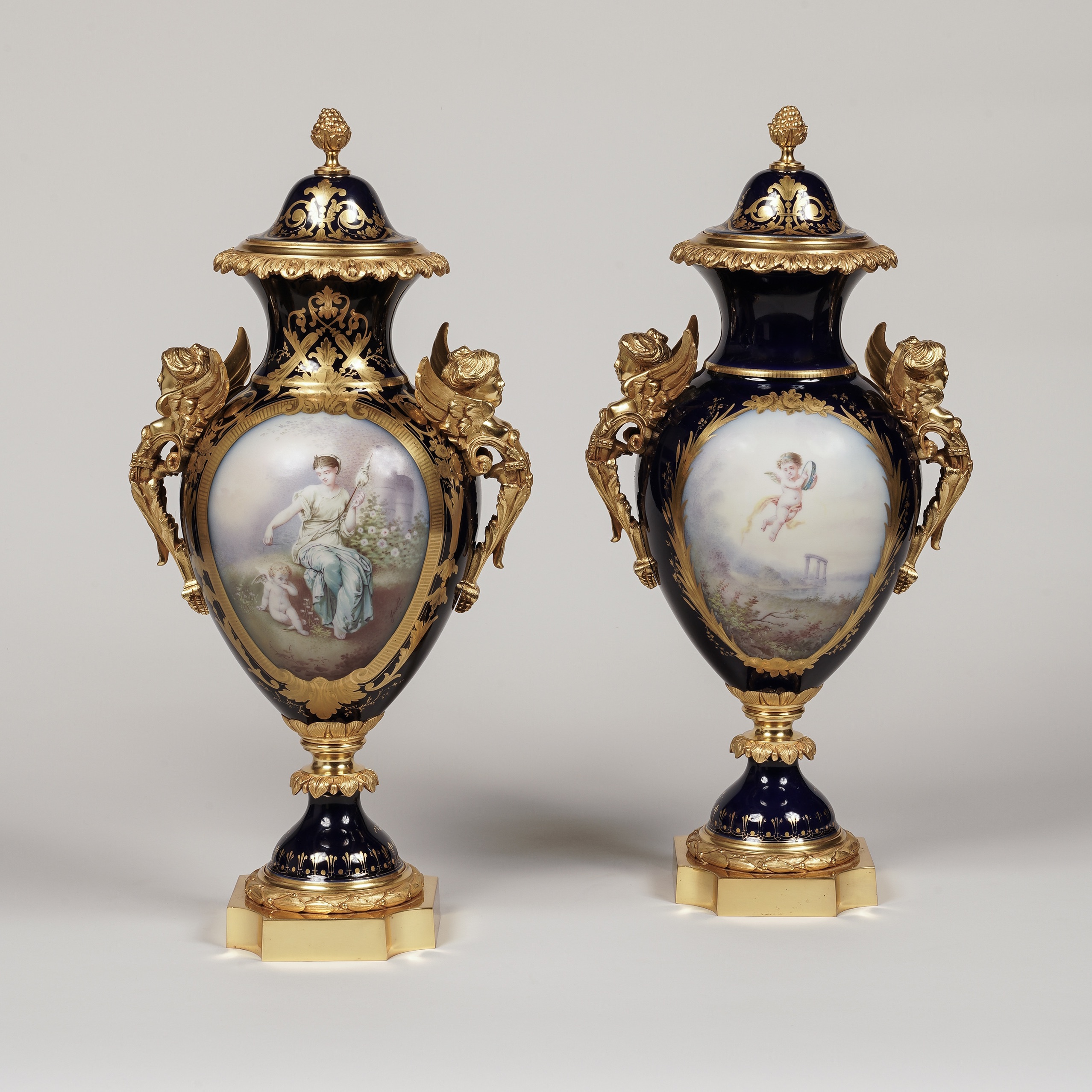 Beautifully hand-painted on a dark cobalt blue background, each vase supported on square ormolu bases with incurved corners, the porcelain baluster bodies with ormolu twin handles modelled as winged herms, with parcel gilt decoration, the front and back having elliptical cartouches depicting mythological figures including cupid; surmounted by a parcel gilt decorated lid with berried finial. Signed "Jocelyn."