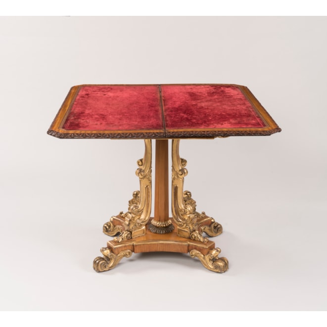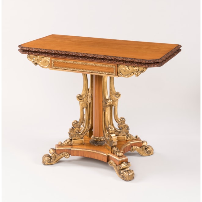 Constructed from satinwood and with parcel gilding throughout, the card tables supported on scrolled feet with hidden casters, a central columnar stem rising from the quadrilateral plinth and flanked by four further gilded and carved supports of c-scrolls, acanthus leaves, and anthemions; above, the rectangular folding tops with canted corners and carved floral moulding to the edges, revealing a velvet-lined playing surface and concealing a compartment underneath of conforming finish; its frieze parcel gilded and with scrolling terminals.