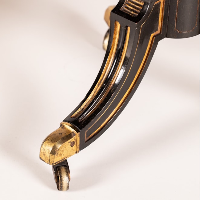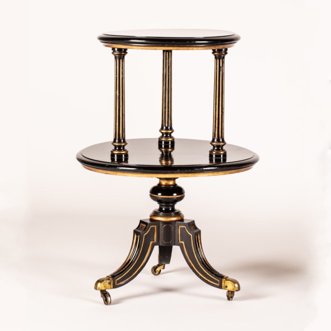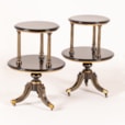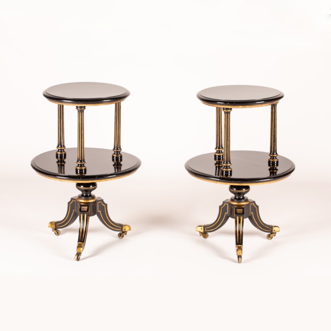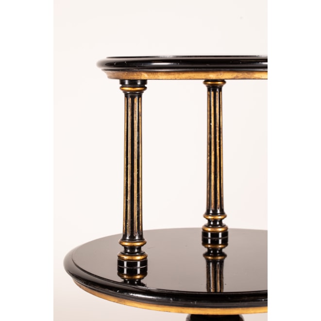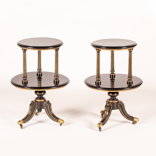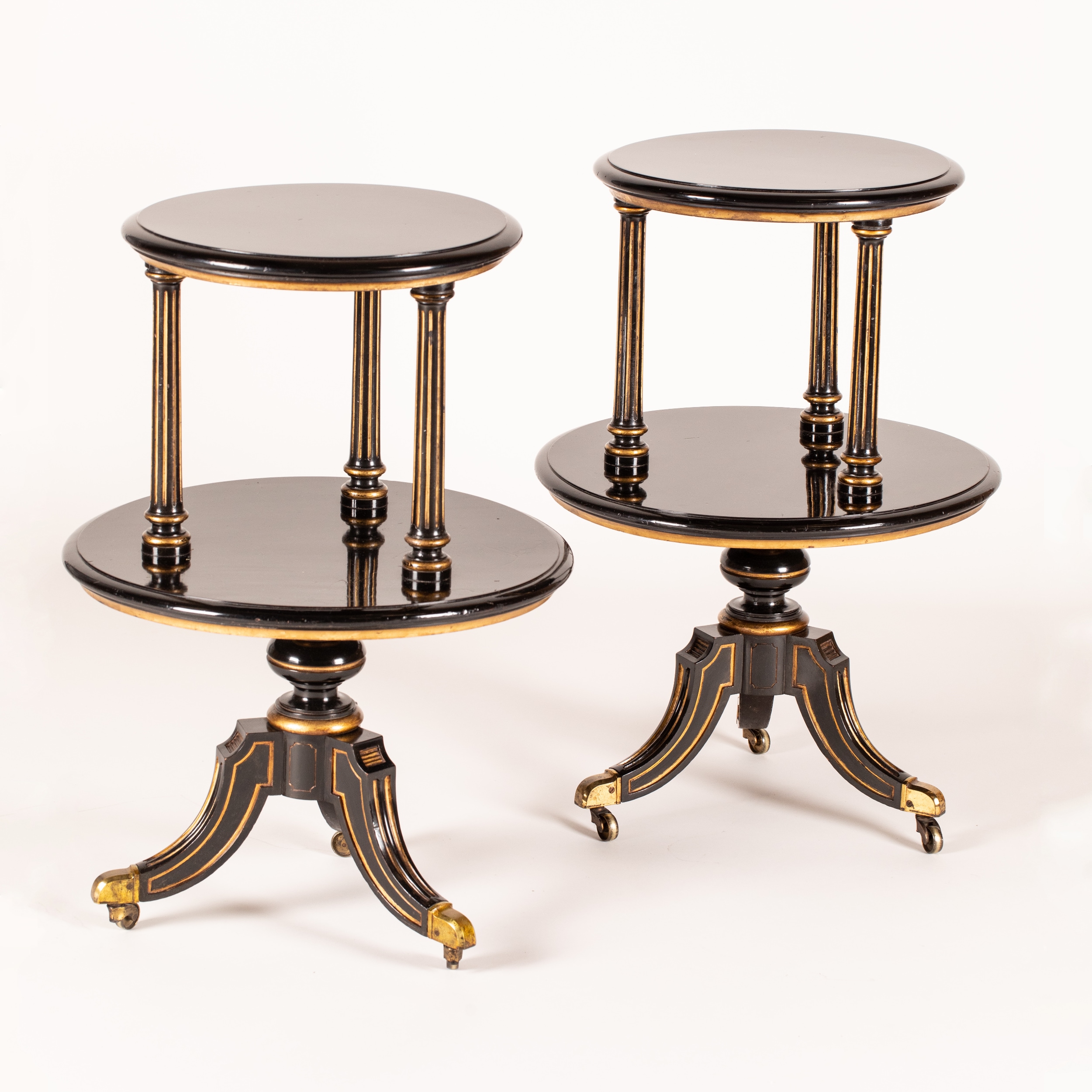The circular tables having lacquered surfaces with a striking sheen, highlighted by parcel gilt details and tripartite swept legs terminating in brass castors; above, the baluster stem supporting the lower tier, which in turn has three fluted columns supporting the smaller upper tier.