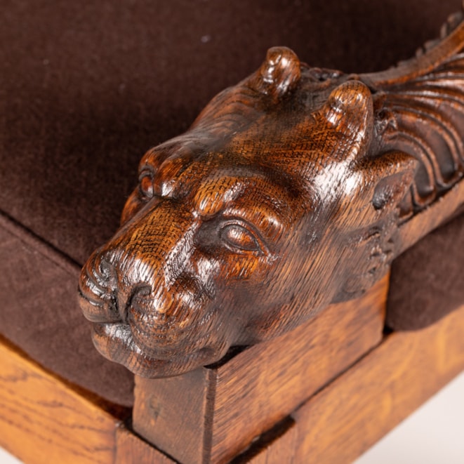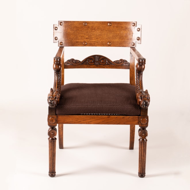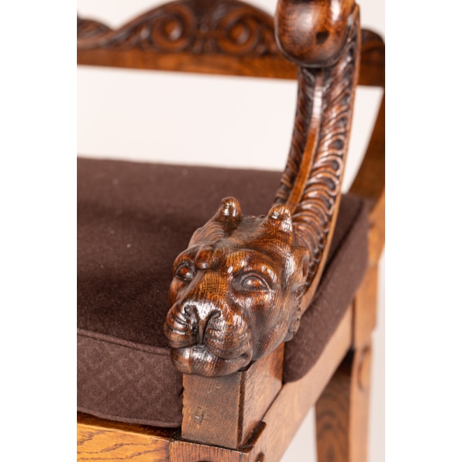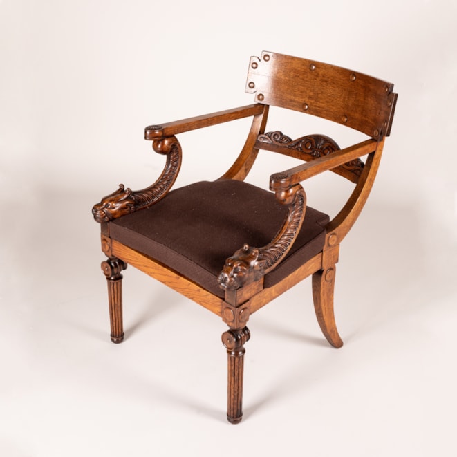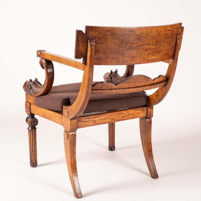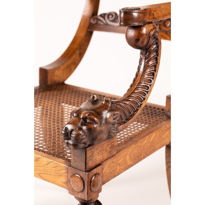 Carved from oak, with the typical Klismos construction having sabre back legs, the tapering front legs turned and reeded with baluster capitals; the swooping and curved studded toprail above a scrolling anthemion-carved crossbar; the straight armrests with applied anthemion terminals held by distinctive leopard head supports flanking the caned seat.