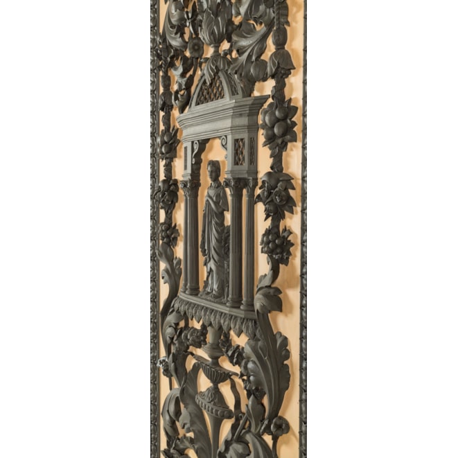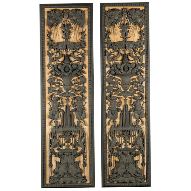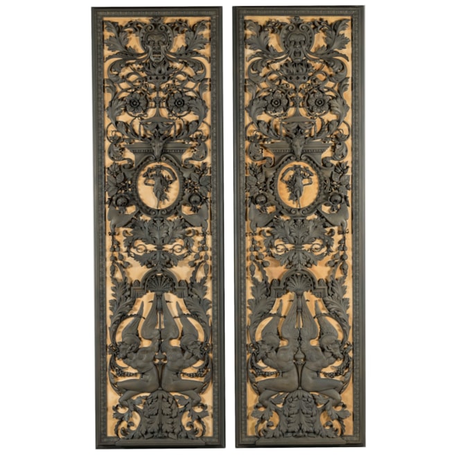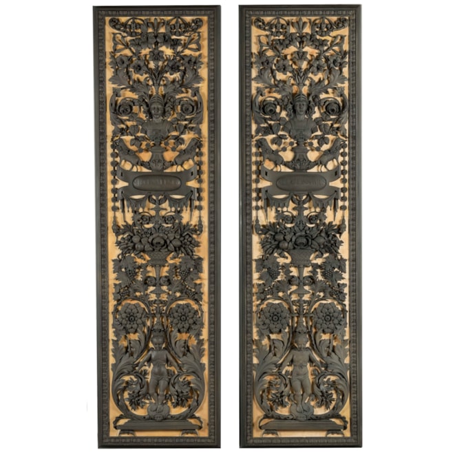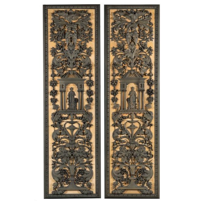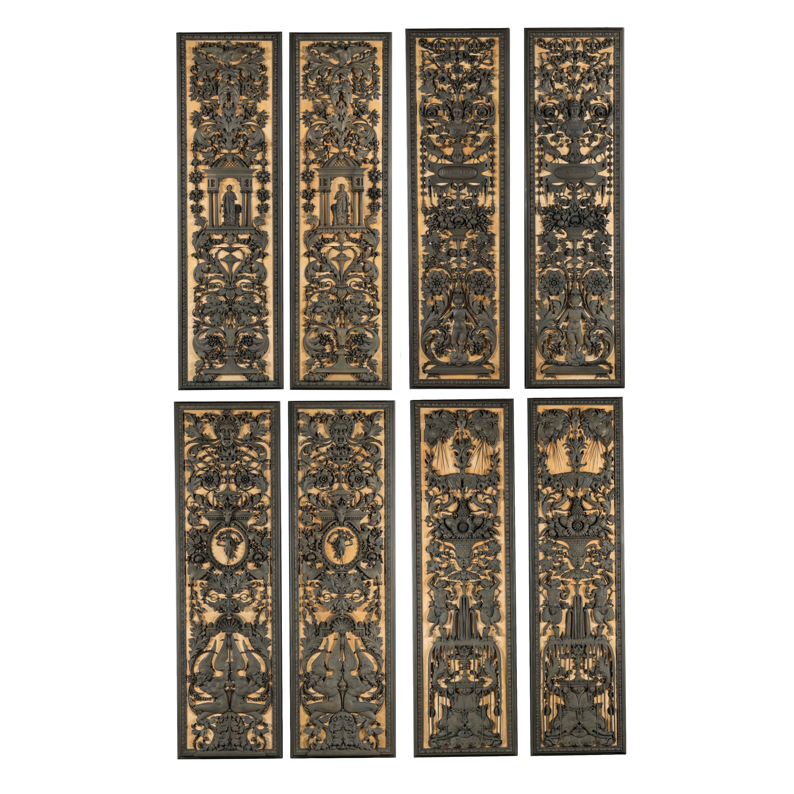 A highly important suite of eight carved and patinated wood panels commissioned by Monsignor Thomas Edward Witham for the Grand Foyer of Lartington Hall, County Durham.
