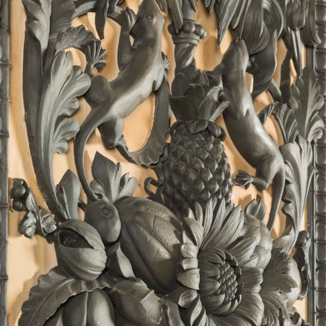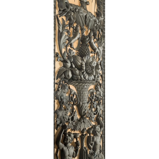 The final pair once again a triumph of woodcarving, dominated by a cascading fountain, each ripple and wave delicately hand carved. Two satyrs dancing among fish, snails, and salamanders, happily consuming from the grapevine reflecting a celebratory and bacchanalian theme. The heads above representing the Four Winds as they maintain order over the natural world below.