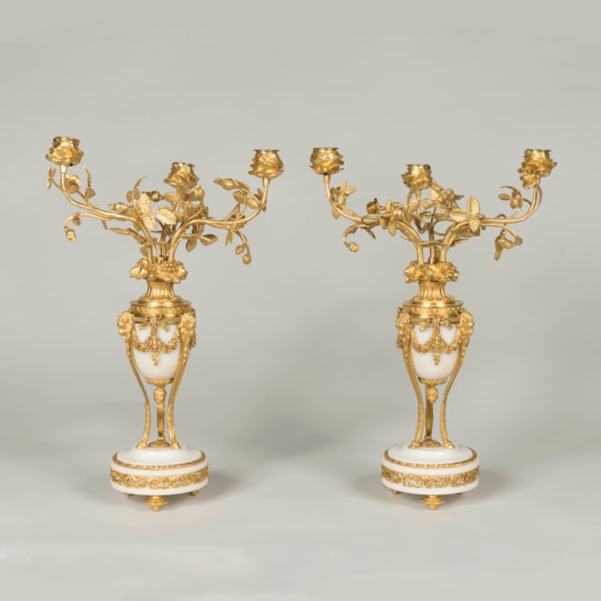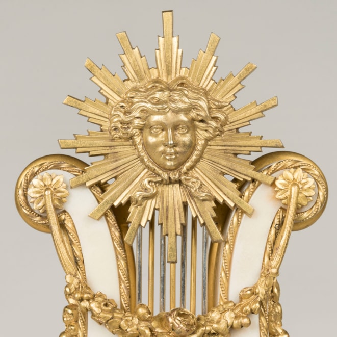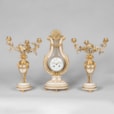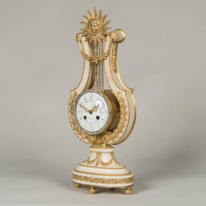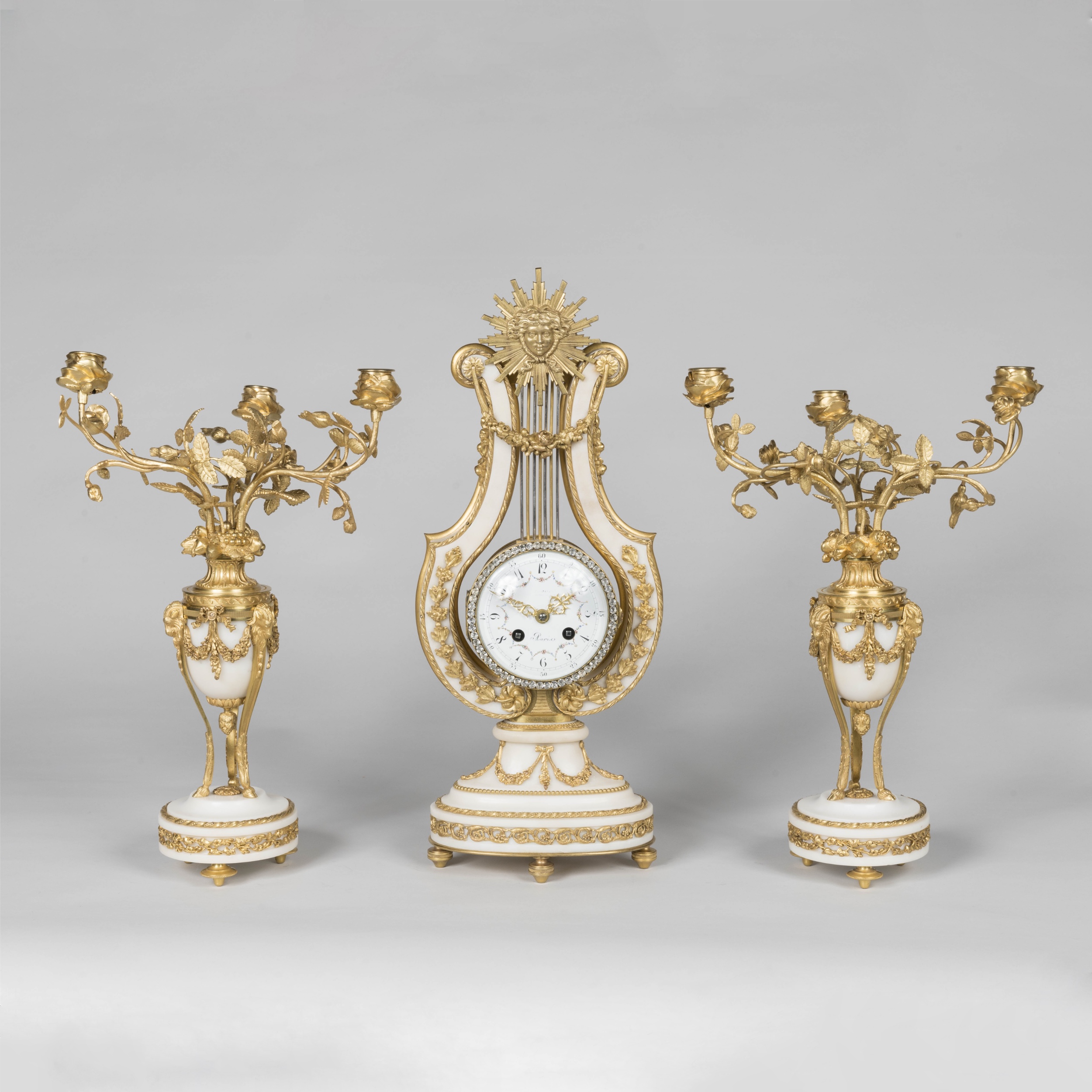 The clock and its accompanying candelabra constructed in gilt bronze mounted Italian Carrara marble; the timepiece with stepped elliptical base rising from toupie feet, dressed with running rinceaux garlands, swags and jewelled torsades; the lyre frame housing a barrel cased floral decorated enamel faced clock, the hours in Arabic numerals, signed 'Causard / Horloger du Roi' and having an eight day movement, chiming on a bell; the lyre surmounted with a mask of Apollo emanating sunburst rays; the pair of candelabra similarly supported on toupie feet and Carrara bases, supporting a tripod vase mounted with ram's heads and issuing three foliate modelled branches with rose-petal cast candlecups.