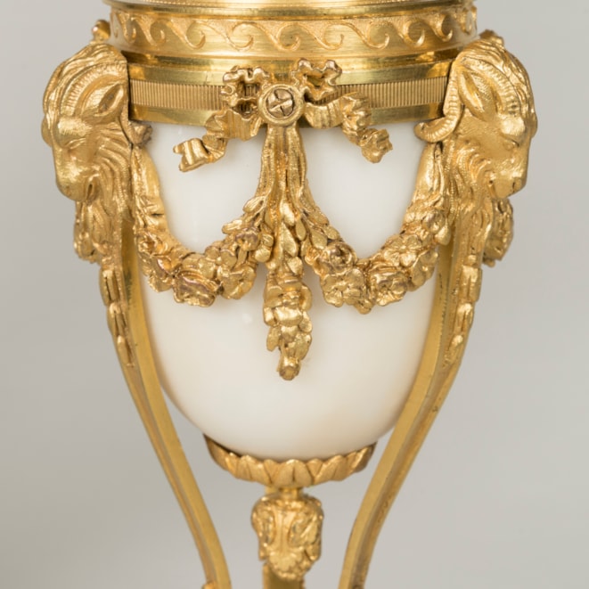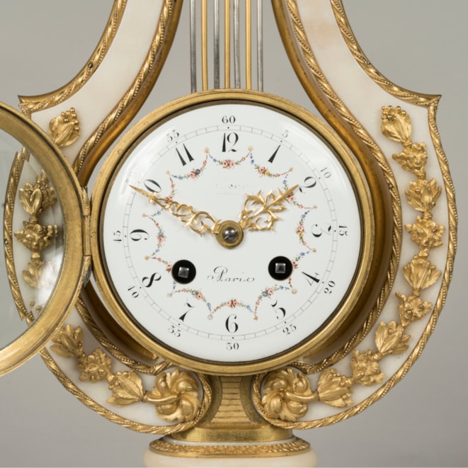 This clock design is taken from Dieudonné Kinable et Dubuisson, and the original Louis XVI model by Jean-Charles Ponchon is to be seen in the New York Frick Collection.