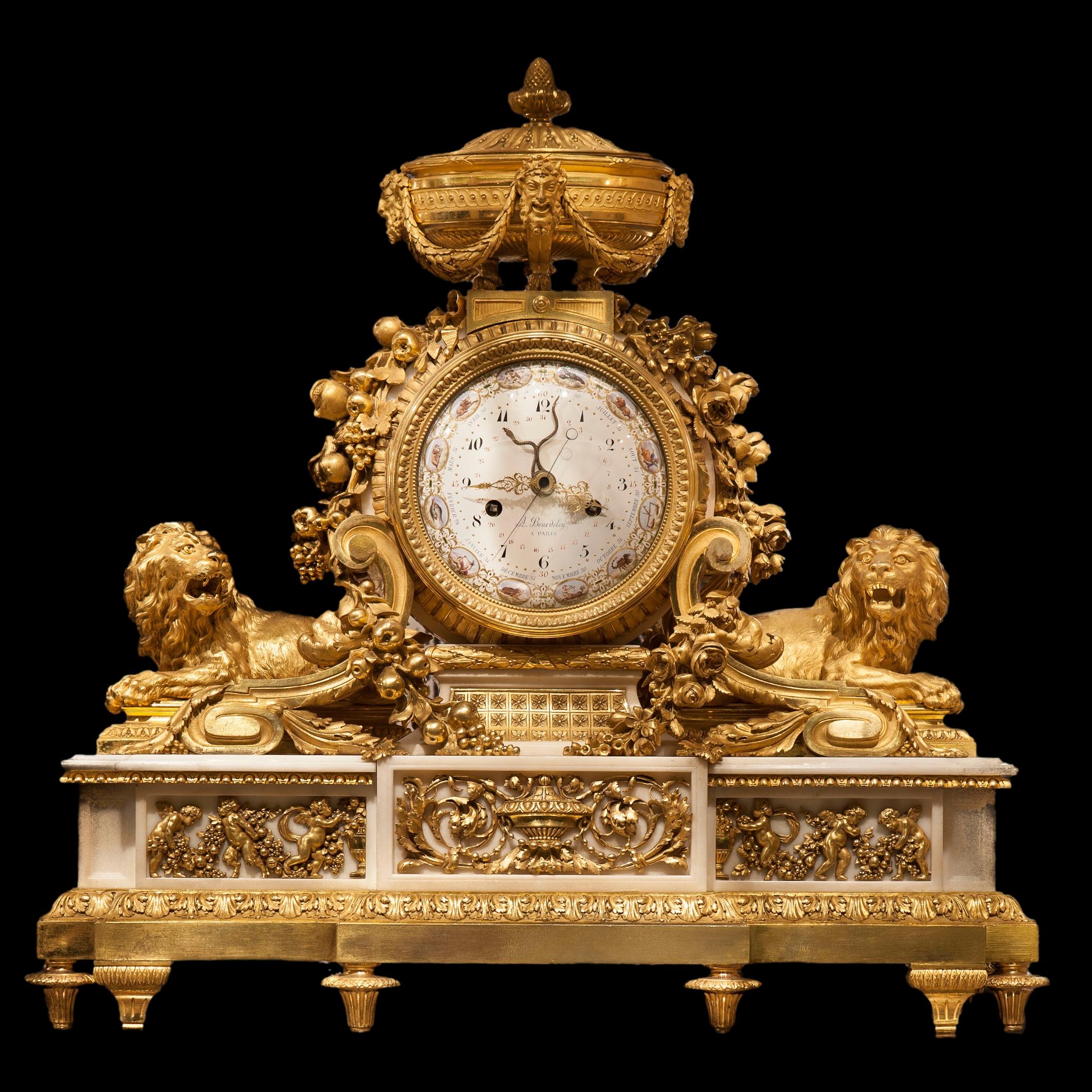 Constructed in a finely cast and chased gilt bronze around a white Carrara marble body; rising from bronze toupie and bêche feet, which support the gentle breakfront form marble platform, being dressed with inset panels adorned with neo-classical designs over a stiff leaf cast guard border; a drum form body, flanked by addorsed lions and draped with flowering and fruiting garlands and ribbands, surmounted by an oblate elliptical lidded urn dressed with swags and Bacchic masks, and having a pine cone finial, houses the circular enamel dial of the clock, hand painted with the signs of the Zodiac, and foliates, hours delineated with Arabic numerals, signed by the maker, ‘A. Beurdeley, Paris’; the eight day, two train movement striking the hours on a bell, and also indicating months, and day date.