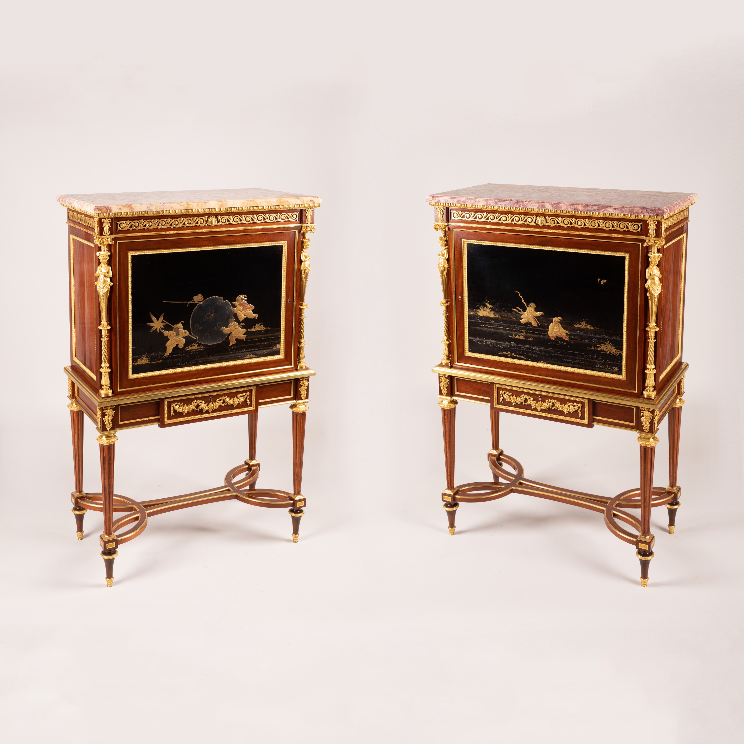 The construction and finish of exquisite and unparalleled quality, veneered in the finest mahogany, inset with lacquer panels and extensively ormolu-mounted; the cabinets rising from tapering toupie feet, the square tapering legs fluted and inlaid with concave filets, conjoined with an interlaced stretcher, the breakfront apron with gilt bronze floral ribbon tied swags and housing a single drawer; over, the cabinets with single hinged doors with large lacquer panels inset within stiff-leaf borders, revealing a fitted interior, gilt bronze caryatids, in the form of festooned Grecian maids bearing baskets of flowers, flank the central door, and the panelled sides are set with stiff leaf gilt bronze castings, with original thumbnail-moulded Brèche Violette marble tops. Stamped and dated by Charles-Guillaume Winckelsen, 1859.