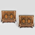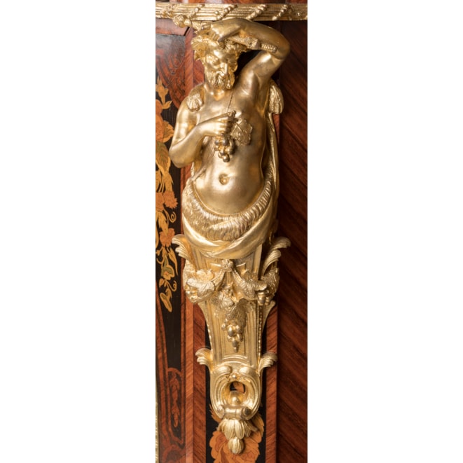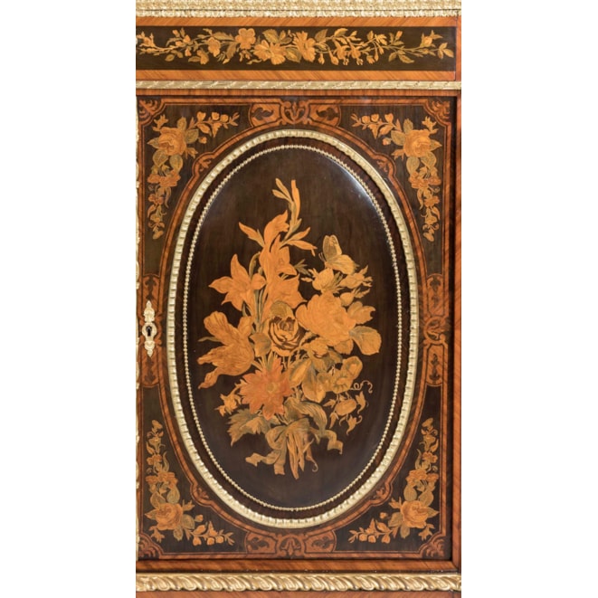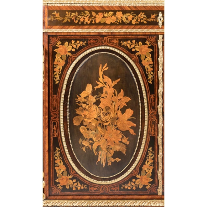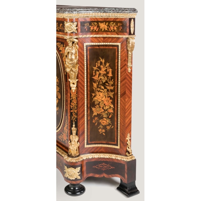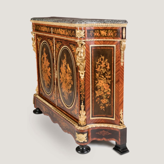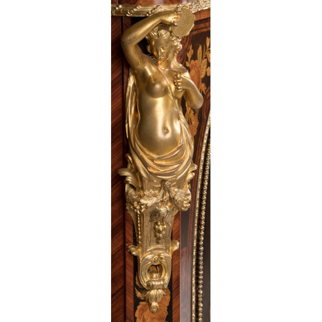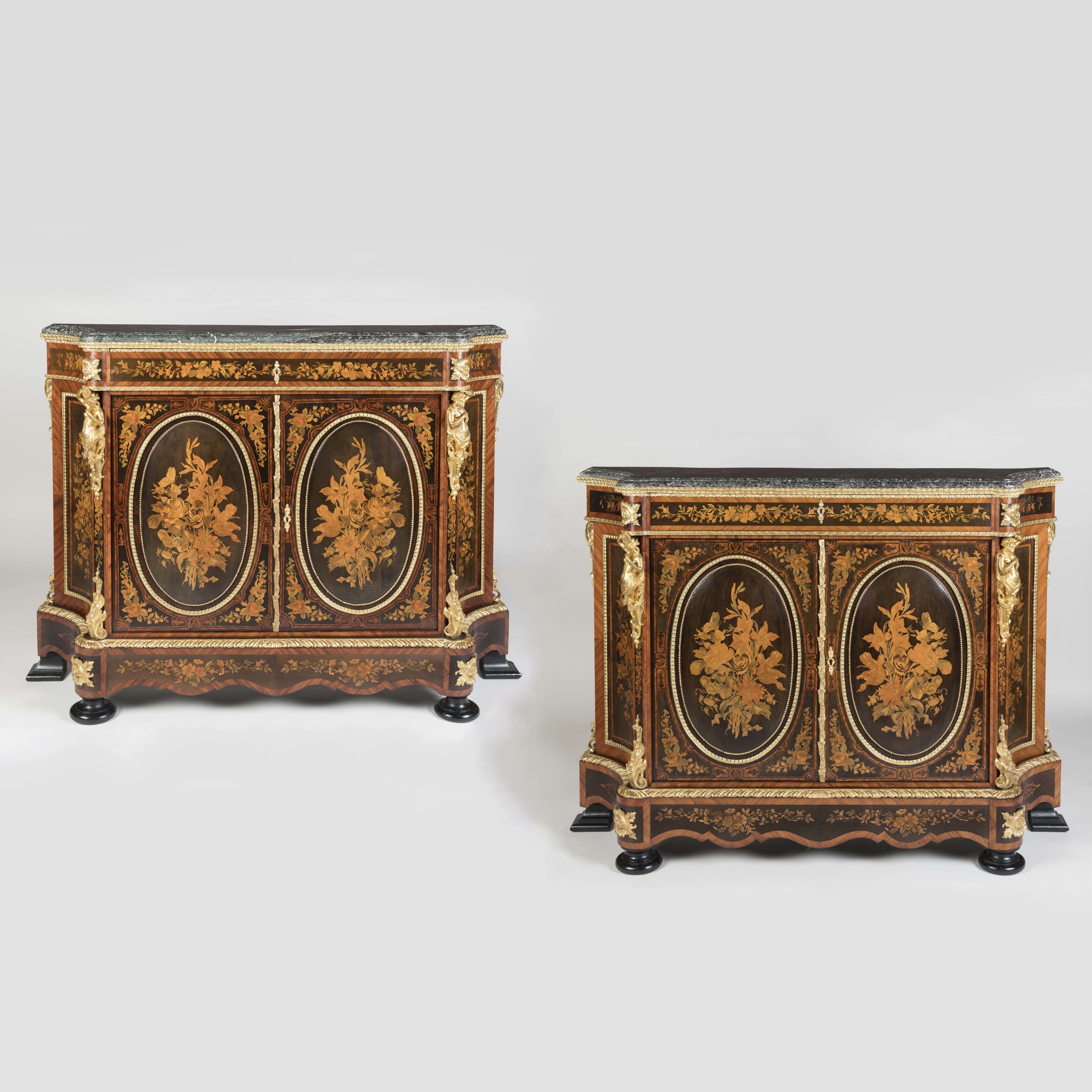 Constructed from tulipwood with inlay of various specimen woods including harewood, fruitwood, ashwood and boxwood, ormolu mounted throughout, the shaped apron of each cabinet supported on ebonised feet, the corners dressed with male and female bronze caryatids flanking the central cupboard doors centred with symmetrical oval panels of floral marquetry on a dark background and further marquetry in the spandrels, the concave sides decorated in a conforming manner of floral marquetry; single lockable drawers housed in the frieze below the inset moulded St-Anne grey marble tops.