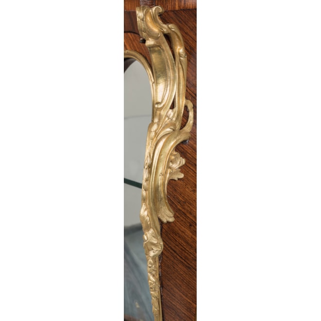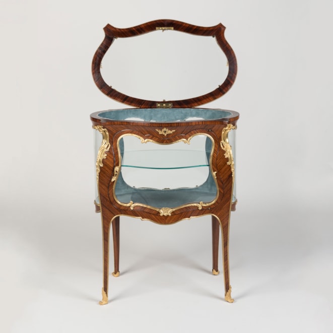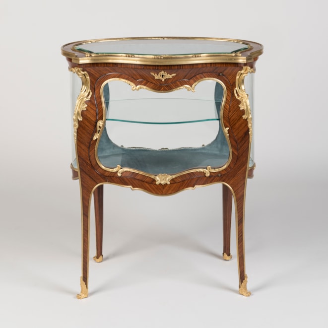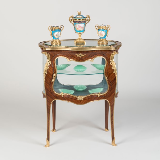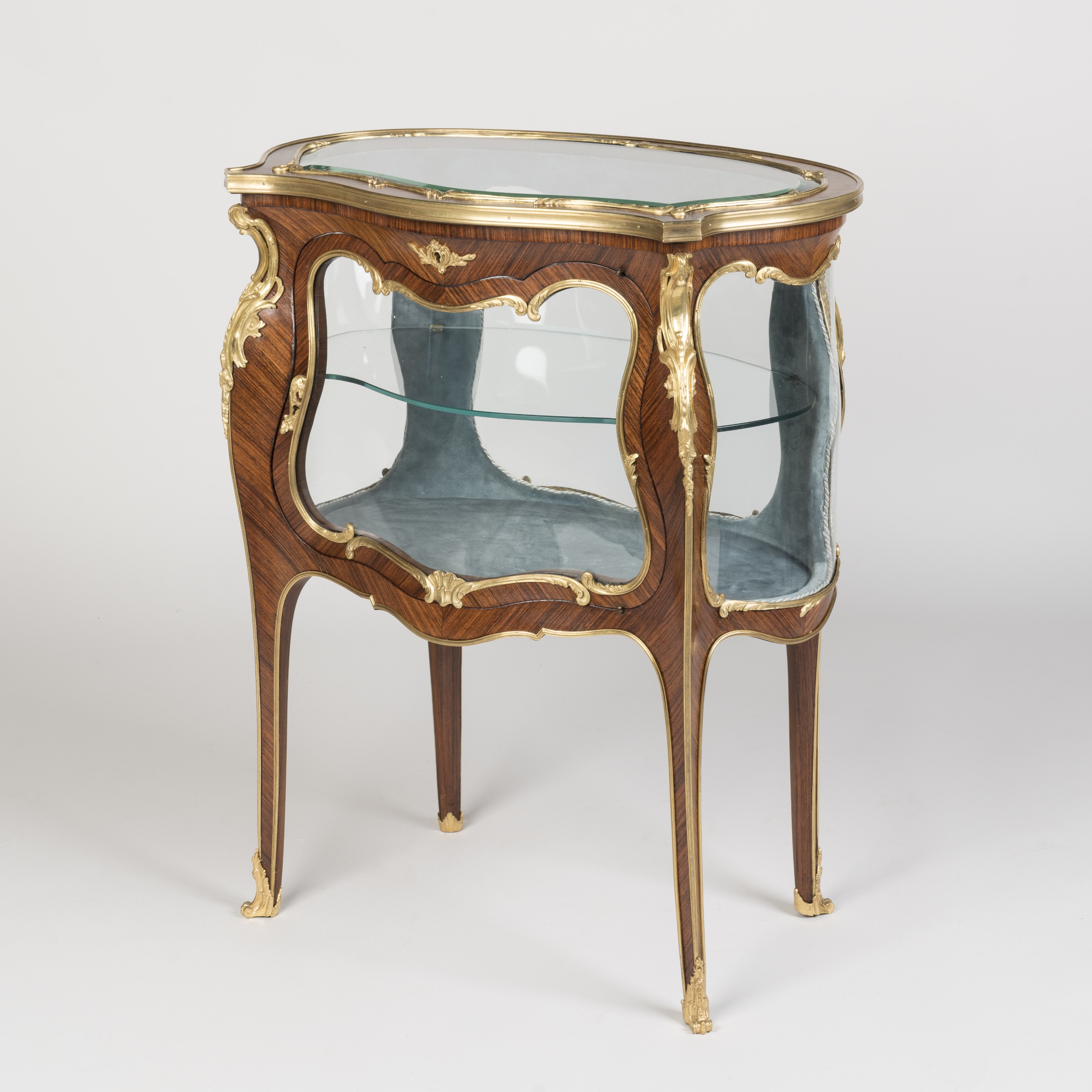 Only the best Parisian workshops were able to craft exquisite display cases of this quality, requiring access not only to attractive Kingwood timbers, but also requiring the skills to fit the curved glass to the bombé frame, itself applied with precise ormolu mounts. Identical sabots are observed on a bijouterie by François Linke previously with Butchoff.