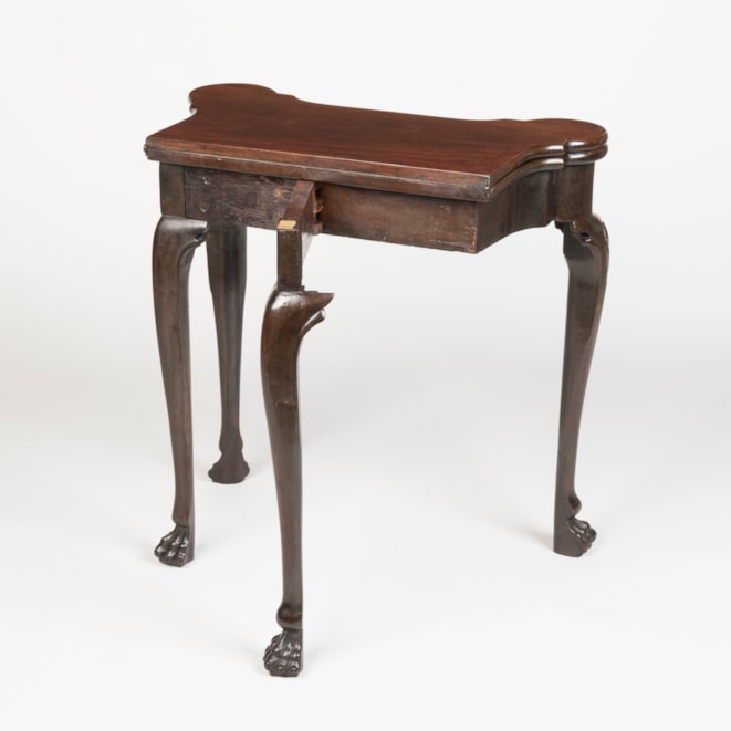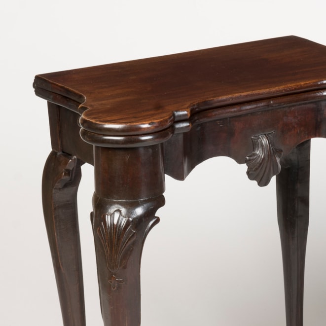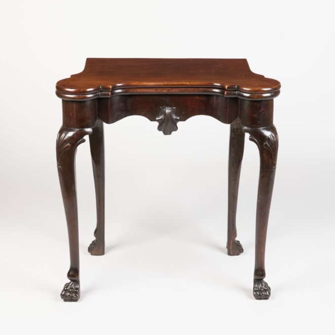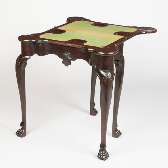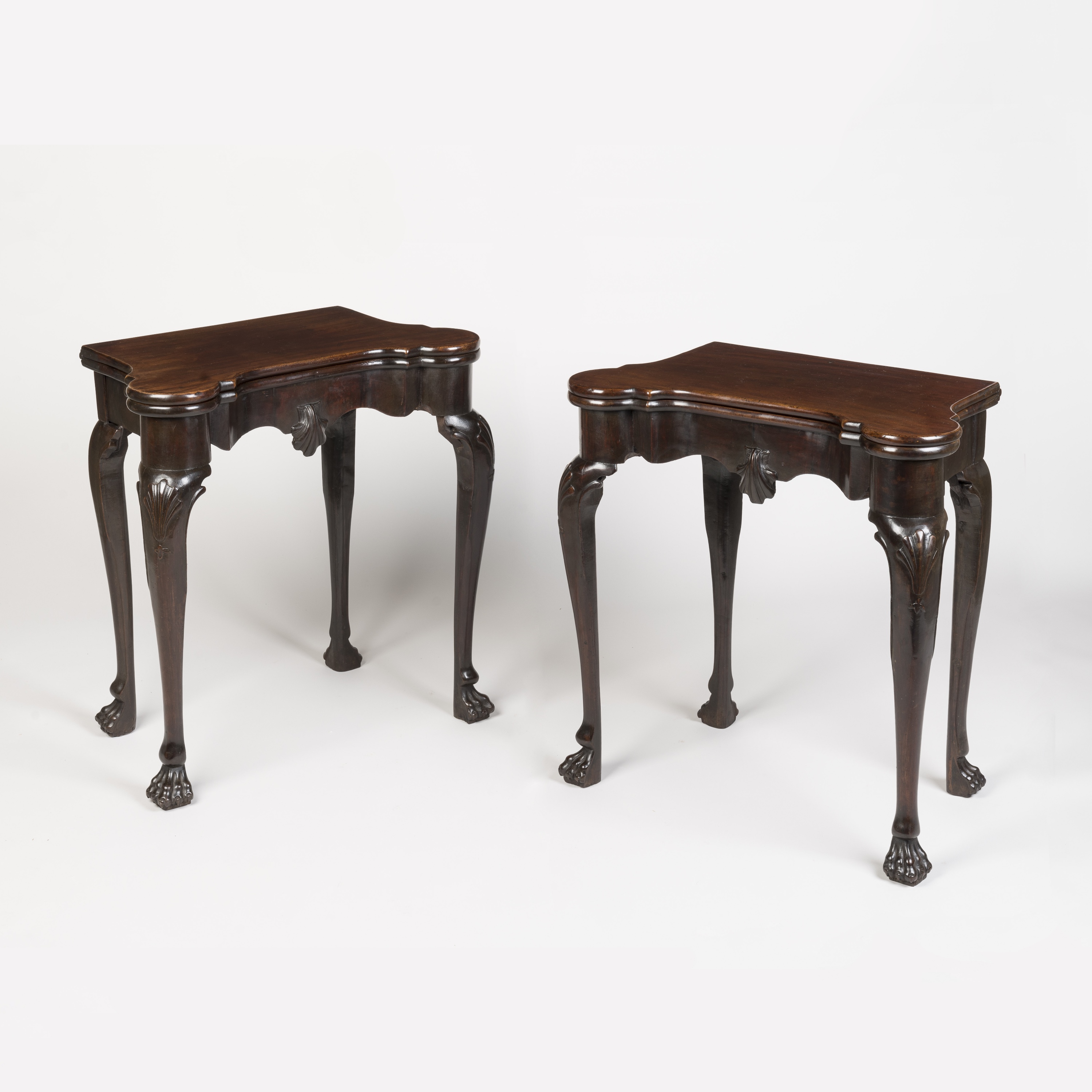 Of unusually small size, the eighteenth-century folding card tables of rich and dark timber, on elegantly drawn shell-carved cabriole legs terminating in lion's paw feet; the shaped apron with a central carved shell; a gate-leg action allowing the tops to fold open, revealing a lined playing surface with rounded corners to support candle trays and inset with money wells.
