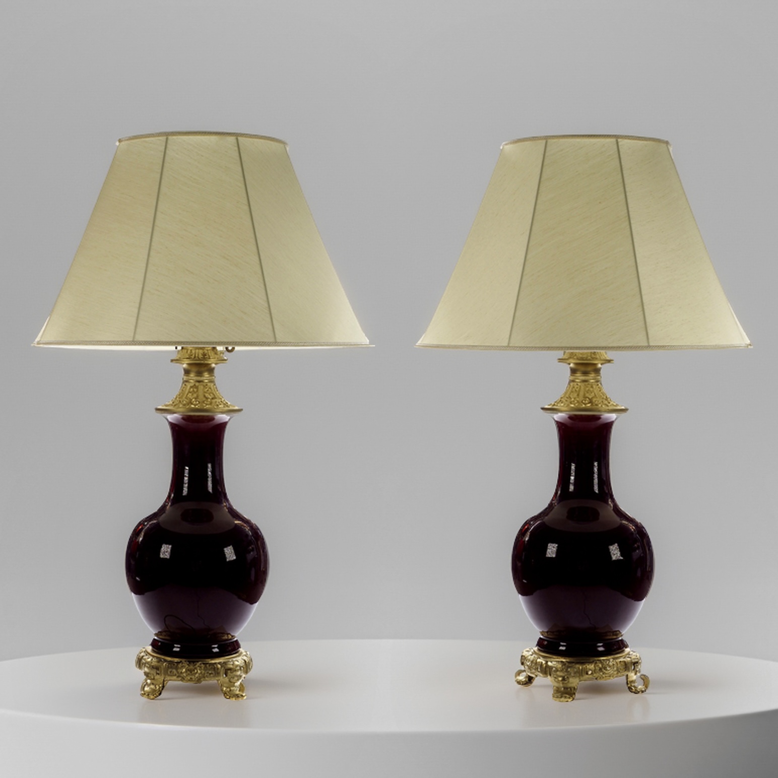 A pair of vintage Chinese Sang de Boeuf (Bull's Blood) baluster form antique vase lamps of important size, dressed with French ormolu mounts.These large lamps (important size) of Chinese Sang de Boeuf baluster form vases, dressed with French ormolu mounts.
