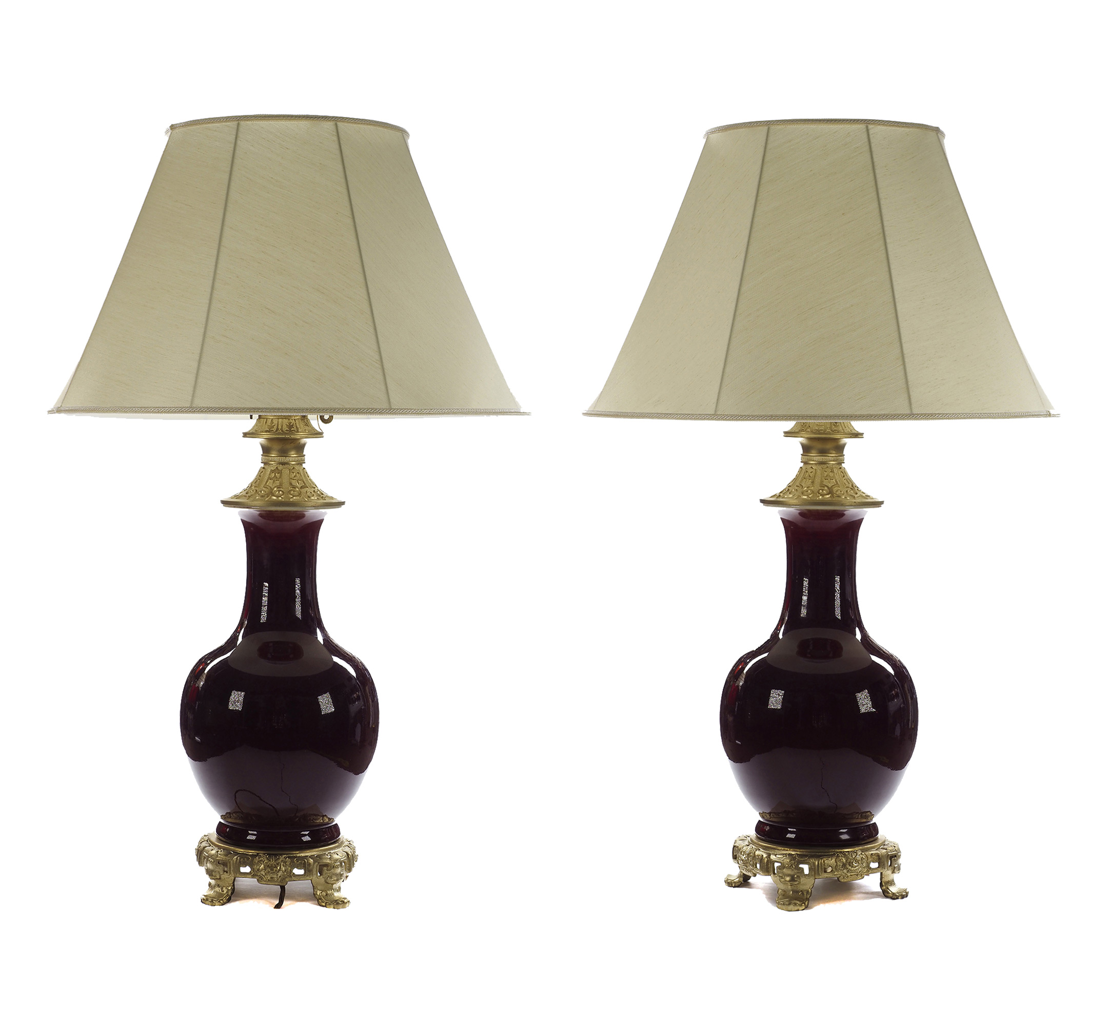 A pair of vintage Chinese Sang de Boeuf (Bull's Blood) baluster form antique vase lamps of important size, dressed with French ormolu mounts.These large lamps (important size) of Chinese Sang de Boeuf baluster form vases, dressed with French ormolu mounts.