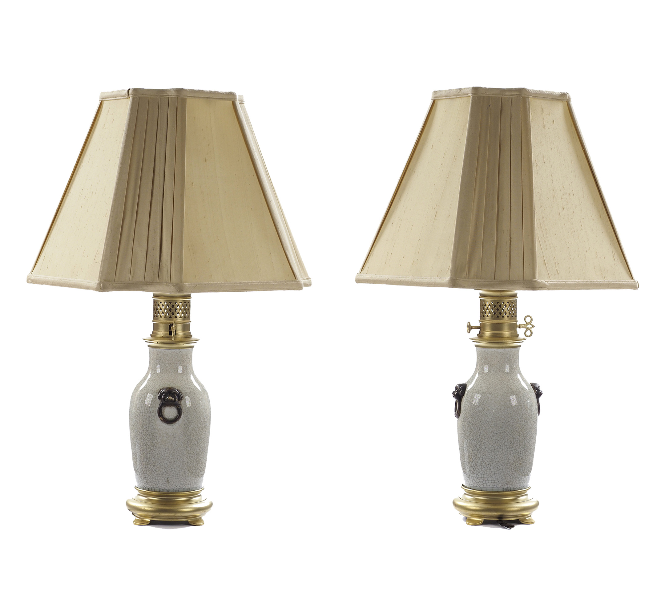 A pair of vintage Chinese crackleware antique vase lamps of baluster form, having applied Taotie masks dressed with French Ormolu mounts. These baluster form pale blue crackleware vases, dressed with Taotie masks, to discourage evil spirits, and dressed with bronze mounts in the Ming manner, were brought to the West, and, with a stroke of inspiration employed as oil lamps, being fitted with ormolu bases in the oriental taste and oil reservoirs and burners; here, the original wick adjusters are retained. Thus, artistic effort, knowledge, and tradition were combined with typical Victorian practicality, and with our adaptation for electricity, a century and a half later, the decorative lighting function is in use again.