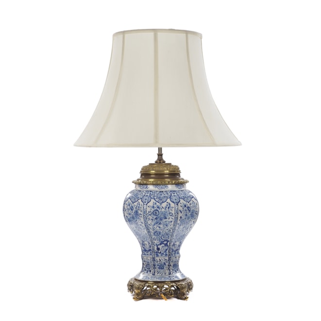 A pair of vintage Dutch Delft antique vase lamps of distended baluster form, decorated in the Chinese manner, dressed with French ormolu mounts. This pair are of important size, dressed with bronze mounts, and were made in the Delft area of Holland, the center of pottery manufacture since the early 17th century, and decorated in the Chinese manner. The Dutch East India Company imported quantities of the newly fashionable Chinoiserie wares. Delft factories manufactured a wide range of articles, with tin-glazes, utilizing Chinese vase forms and decoration.
