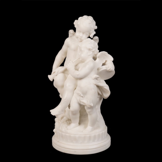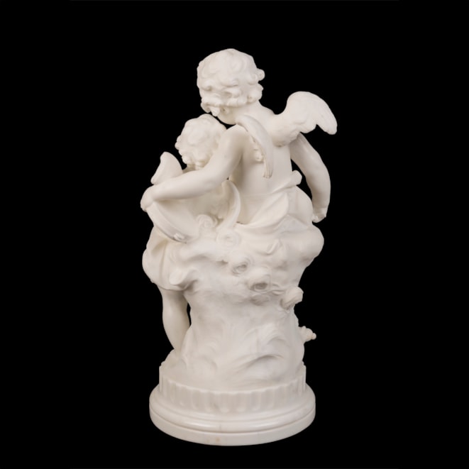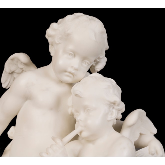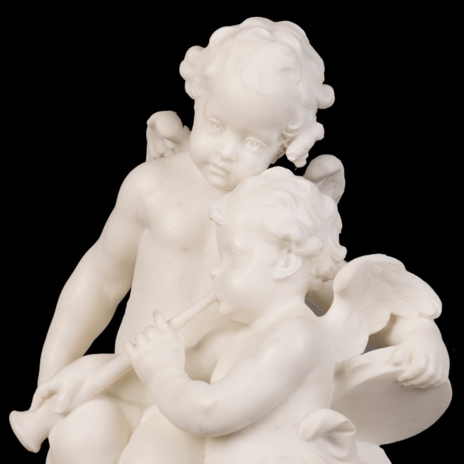 Carved from a single block of Carrara marble, the winged putti cavorting together, one playing a trumpet and the other a tambourine. With a pan flute at their feet and quiver with arrows among roses. The circular base bearing the artist's monogram "AM."