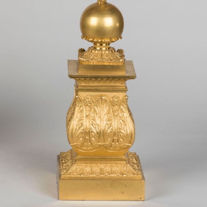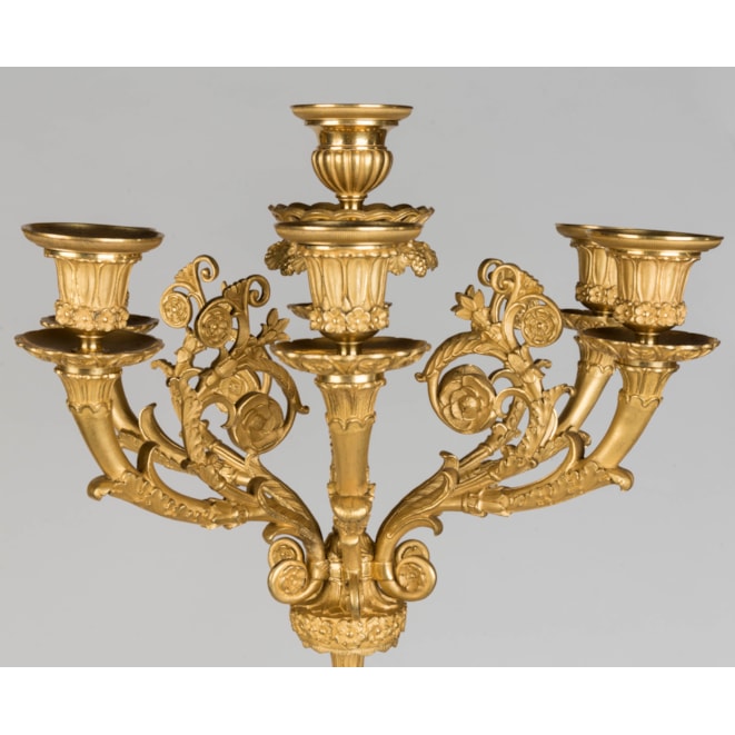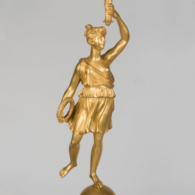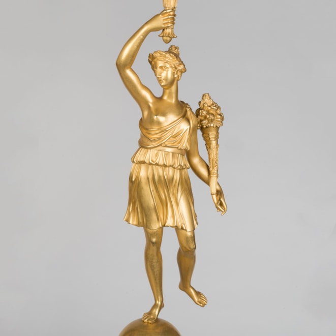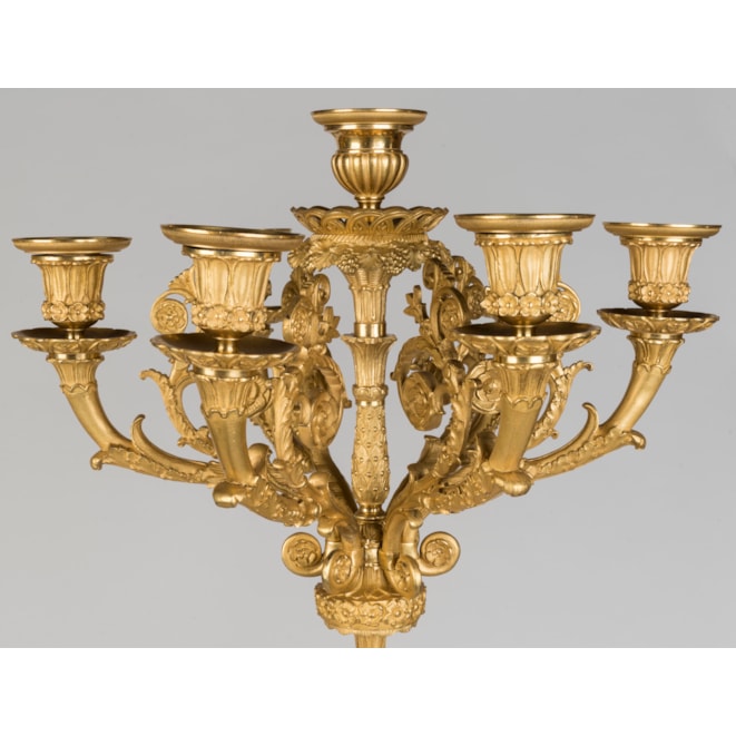The fire-gilded surfaces with burnished and matte finish, modelled as one female and one male figure wearing togas, balancing on spheres, one holding a wreath and the other a cornucopia, with S-curved arms and 7 candle cups complete with bobèches.