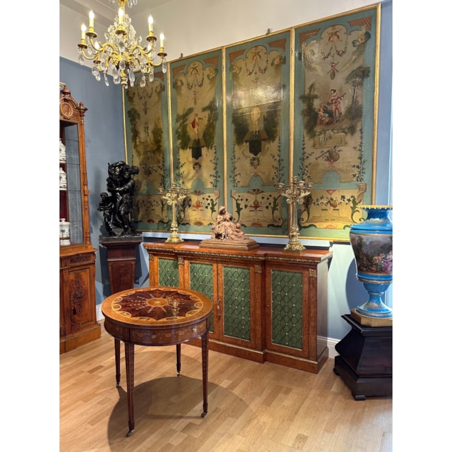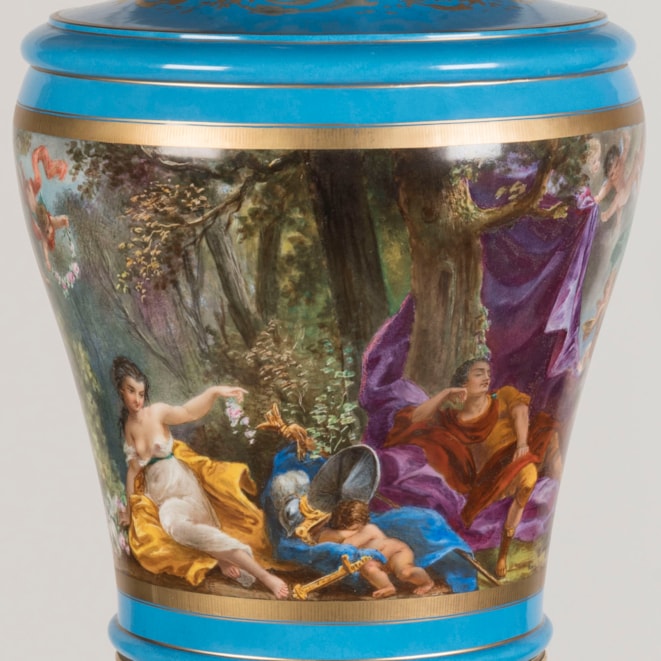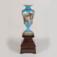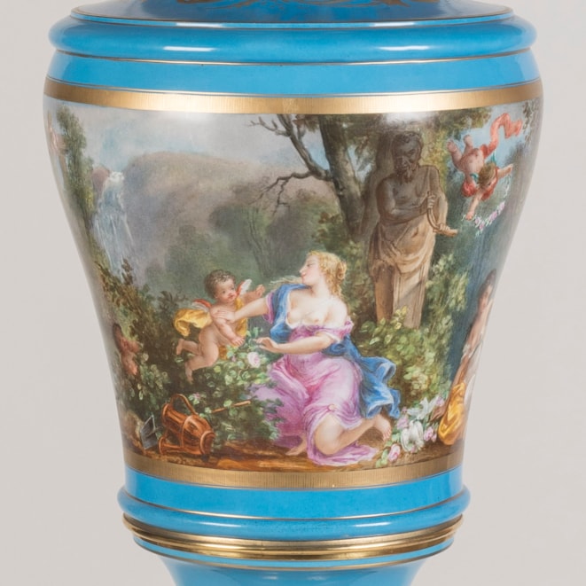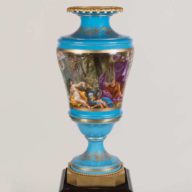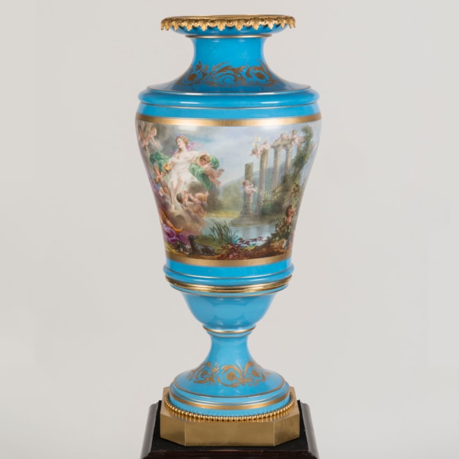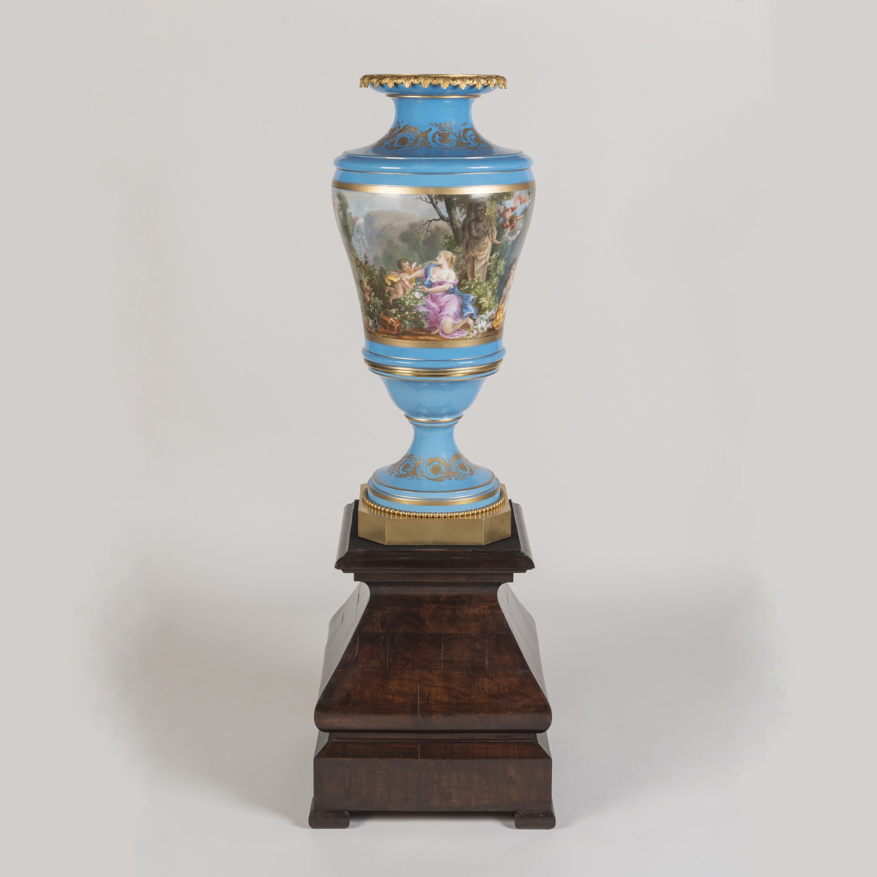Standing at three feet tall, the baluster-shaped porcelain vase raised on an ormolu octagonal base with pearl band, and an ormolu stiff-leaf collar at the lip. The decoration scheme carried out on a light blue ground with gilt highlights throughout; a continuous scene wrapping around the vase's body depicting bucolic scenes inspired by Classical Antiquity populated with maidens, heroes, putti, and doves within a natural landscape. Together with a mahogany pedestal.