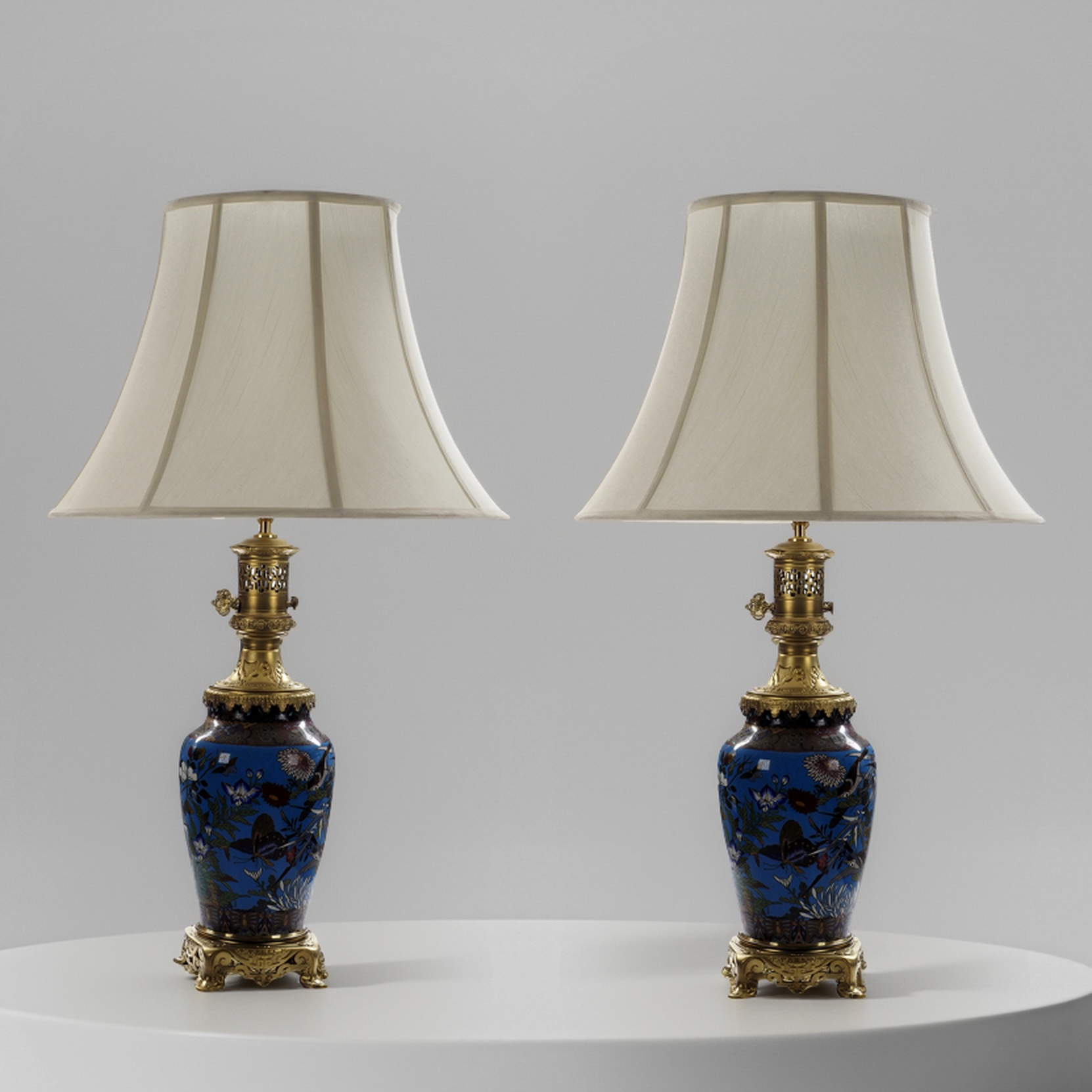 In the 17th century England & Holland, two small, warlike seafaring nations vied for supremacy in the newly established trade in the then extraordinary commodities, such as spices, silks, porcelain, lacquer, and design, which now are taken for granted. Chinese translucent porcelain, unknown at that time in Europe, and the affiliated decorative patterns, ('Willow pattern' prunus flowers, mythological animals court scenes and dragons, inter alia) were, as is said 'all the rage'. The ancient art of 'Cloisonné' enamelling using coloured molten glass was used in China some two millennia BC. The word comes from the French for 'cell', as a metal surface was dressed with patterns in brass, gold or silver wire, and the 'cells' created were then enamelled, and polished to a fine and even surface. In the present case of our lamps, initially Chinese vases, foliates and birds are to be seen. These vases were brought to the West, and, with a stroke of inspiration employed as oil lamps, being fitted with ormolu bases in the oriental taste and oil reservoirs and burners; here, the original wick adjusters are retained. Thus, artistic effort, knowledge and tradition were combined with typical Victorian practicality, and with our adaptation for electricity, a century and a half later, the decorative lighting function is in use again.