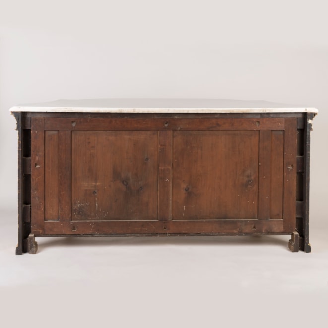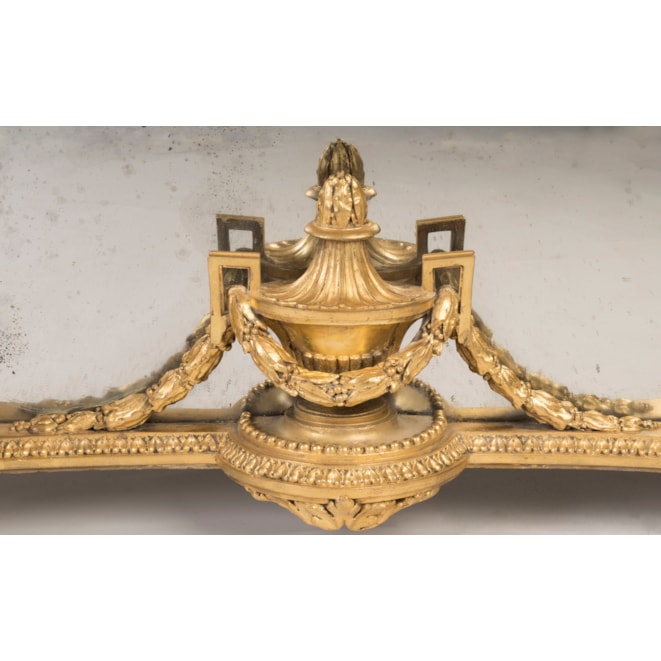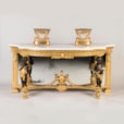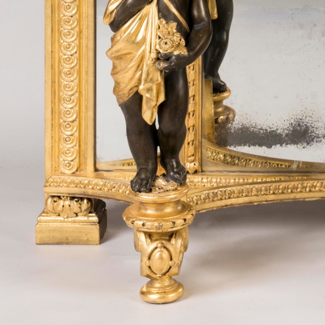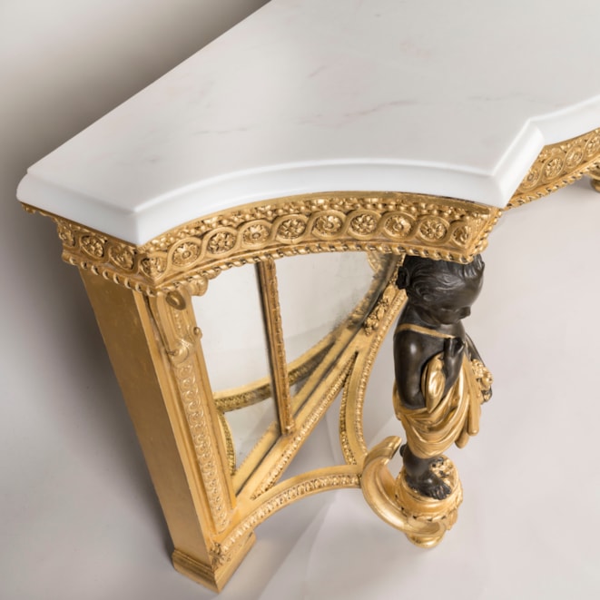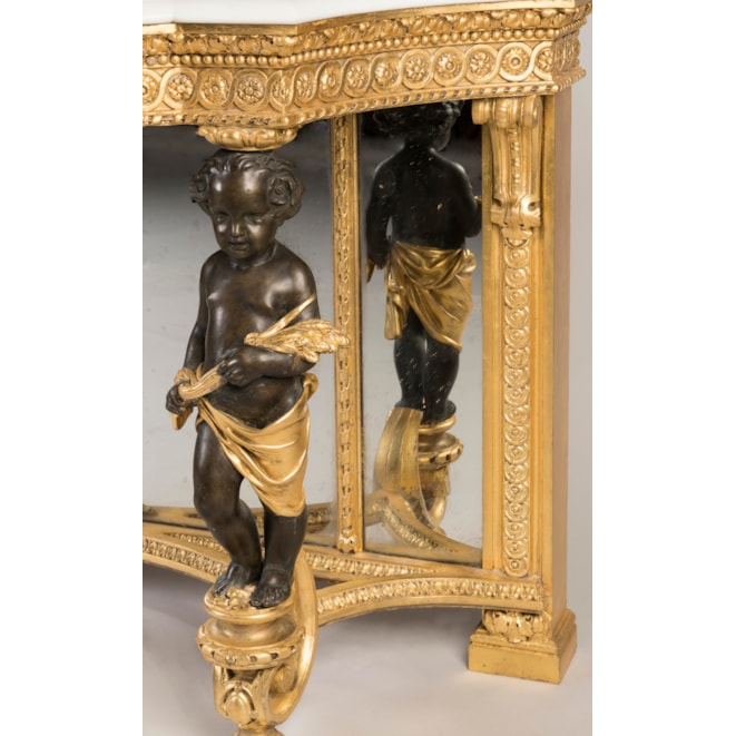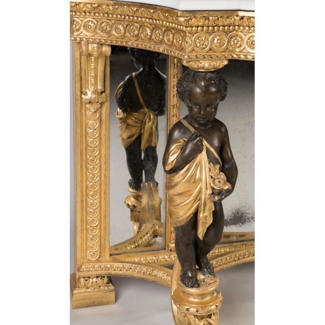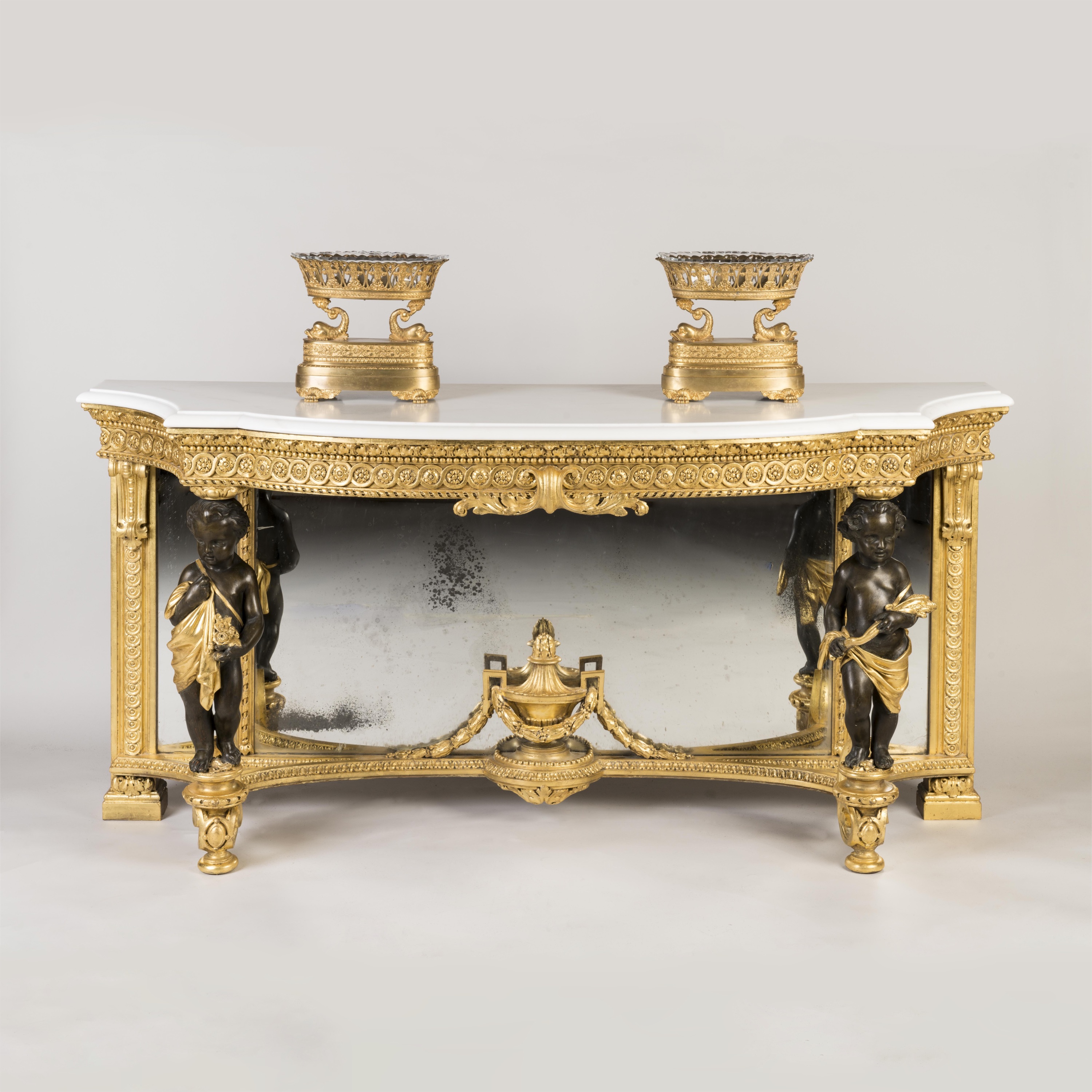 Gilt wood, with decorated highlights; of arc-en-arbalette form, the white Carrara platform having a thumbnail moulded edge, being supported by a framework of two draped putti, one carrying a posy of roses, and his partner bearing ears of wheat, standing on scrollwork bases rising from columnar feet; the backboard housing an original mirror, within a vertical guilloche dressed gilt wood frame; the central Attic urn issues bellflower garlands, the concave stretcher, conjoining the putti; over these, the apron is adorned with a central guilloche band, enclosed within a running stiff leaf pattern over, and running pearl design below.