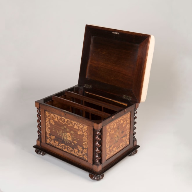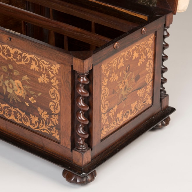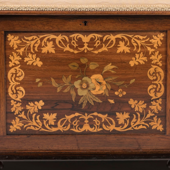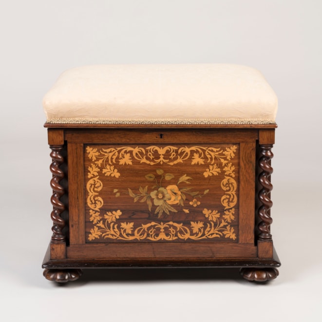 A delightful and practical seat made of rosewood and incorporating marquetry inlays of boxwood and harewood, supported on hidden casters within lobed bun feet, the corner supports turned in a barley twist flanking the marquetry panels adorning all sides. A cushioned and upholstered seat opening to reveal the interior with subdivisions.